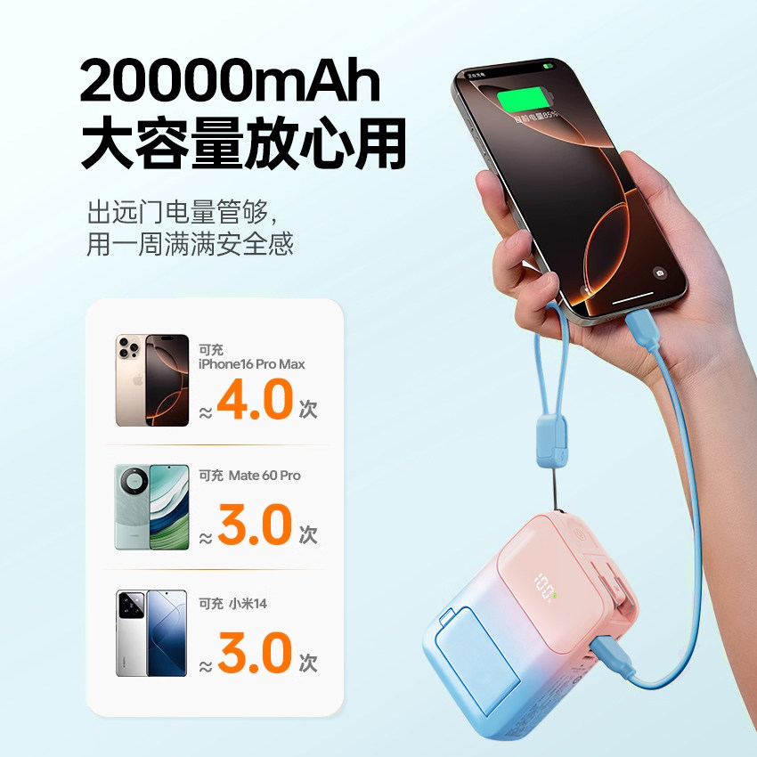 【3C认证充电宝】品胜自带插头20000毫安大容量10000充电器二合一电霸标识自带线适用苹果17小米移动电源