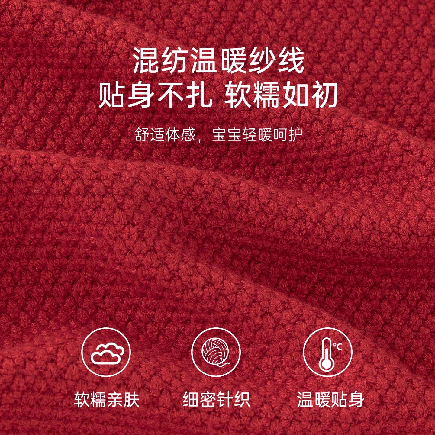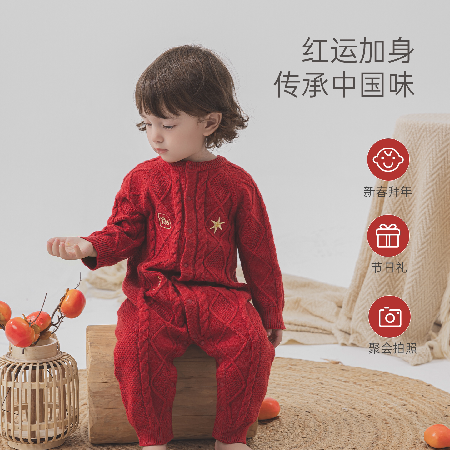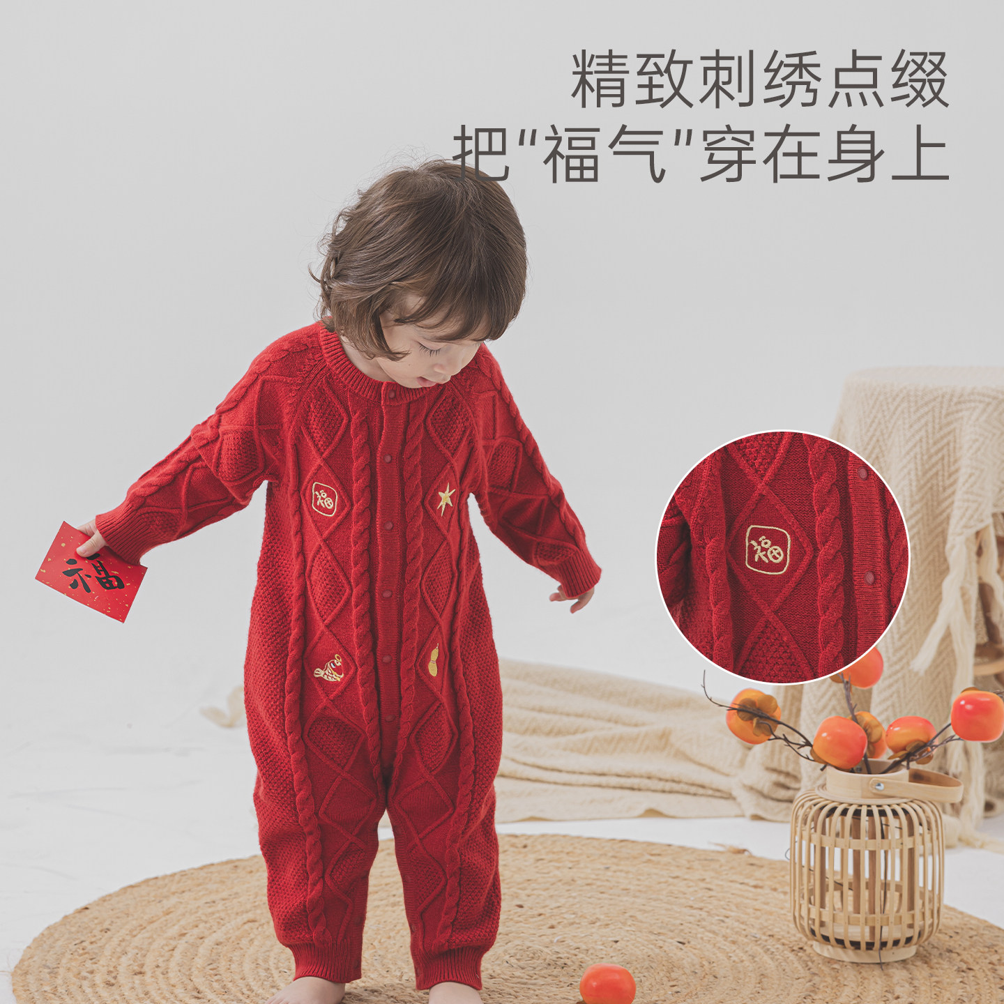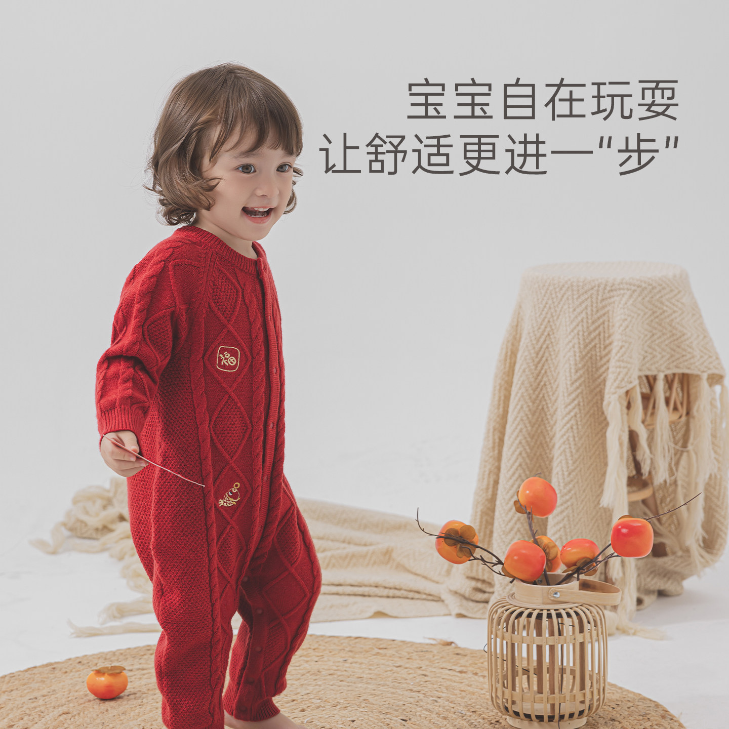 木生棉婴儿针织毛衣秋冬季宝宝连体哈衣爬服红色喜庆满月周岁年服