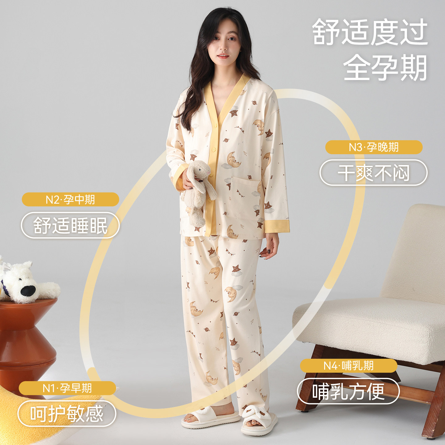 都市丽人纯棉月子服34月份产后哺乳怀孕期孕妇喂奶产妇带胸垫睡衣
