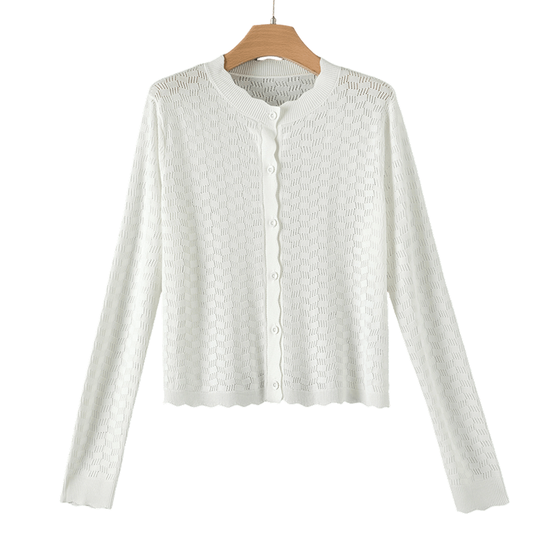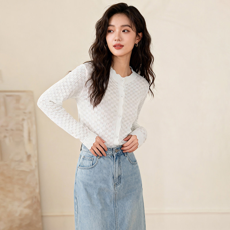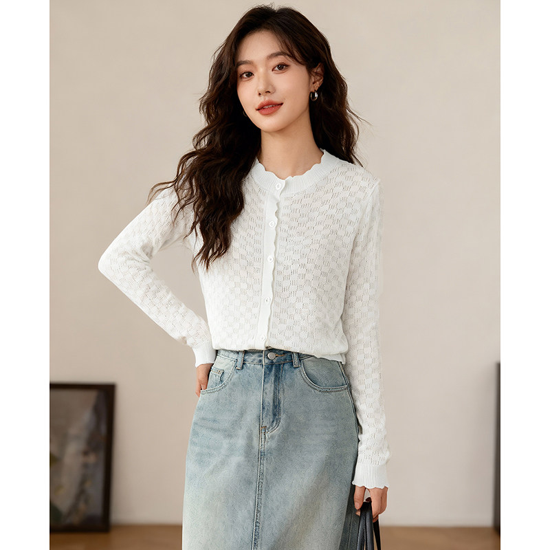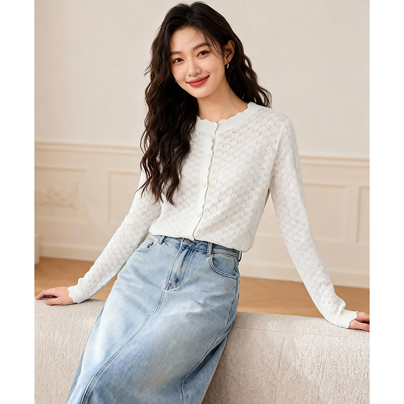 晚白2026年春新款经典圆领开衫时尚镂空提花舒适百搭大码针织衫女