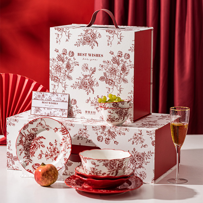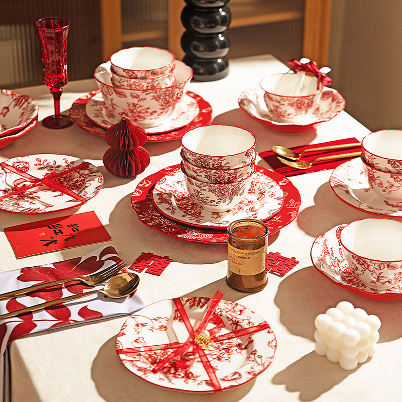 高档碗碟餐具陶瓷新婚礼物送新娘红色碗盘筷套装乔迁新居结婚礼盒