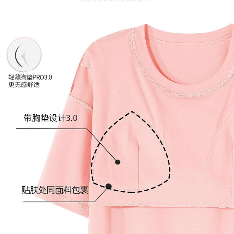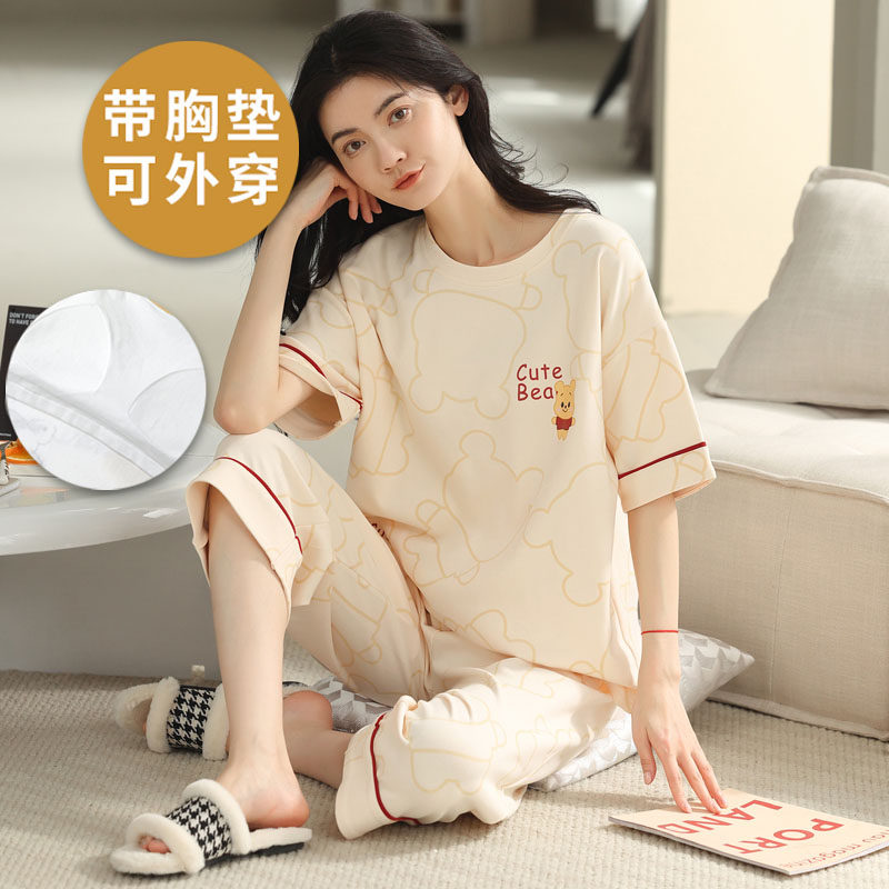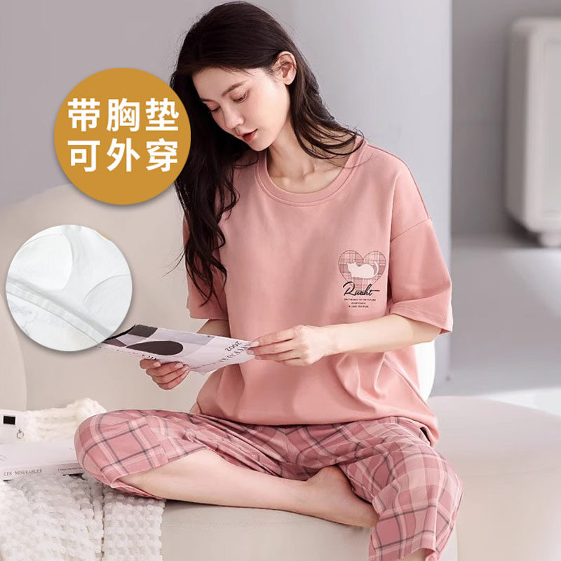 浪莎2025新款带胸垫纯棉睡衣女夏季短袖七分裤家居服套装可外穿