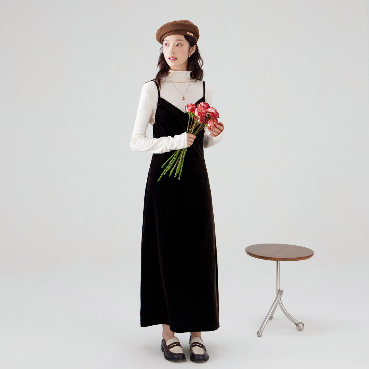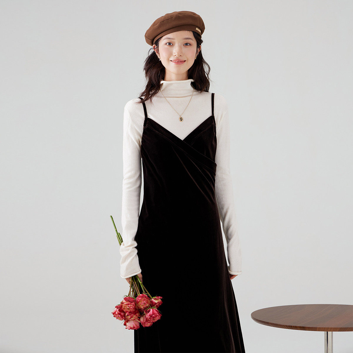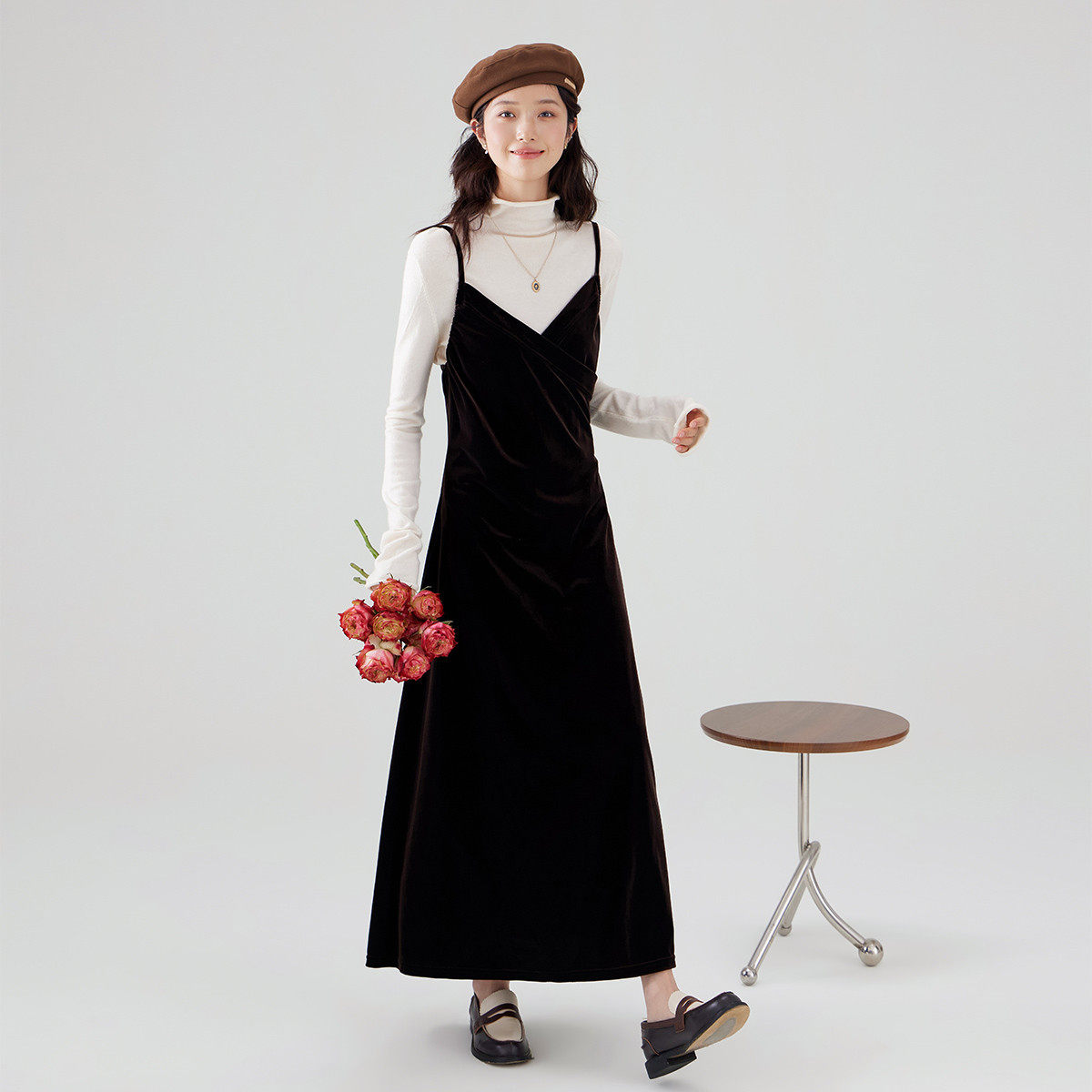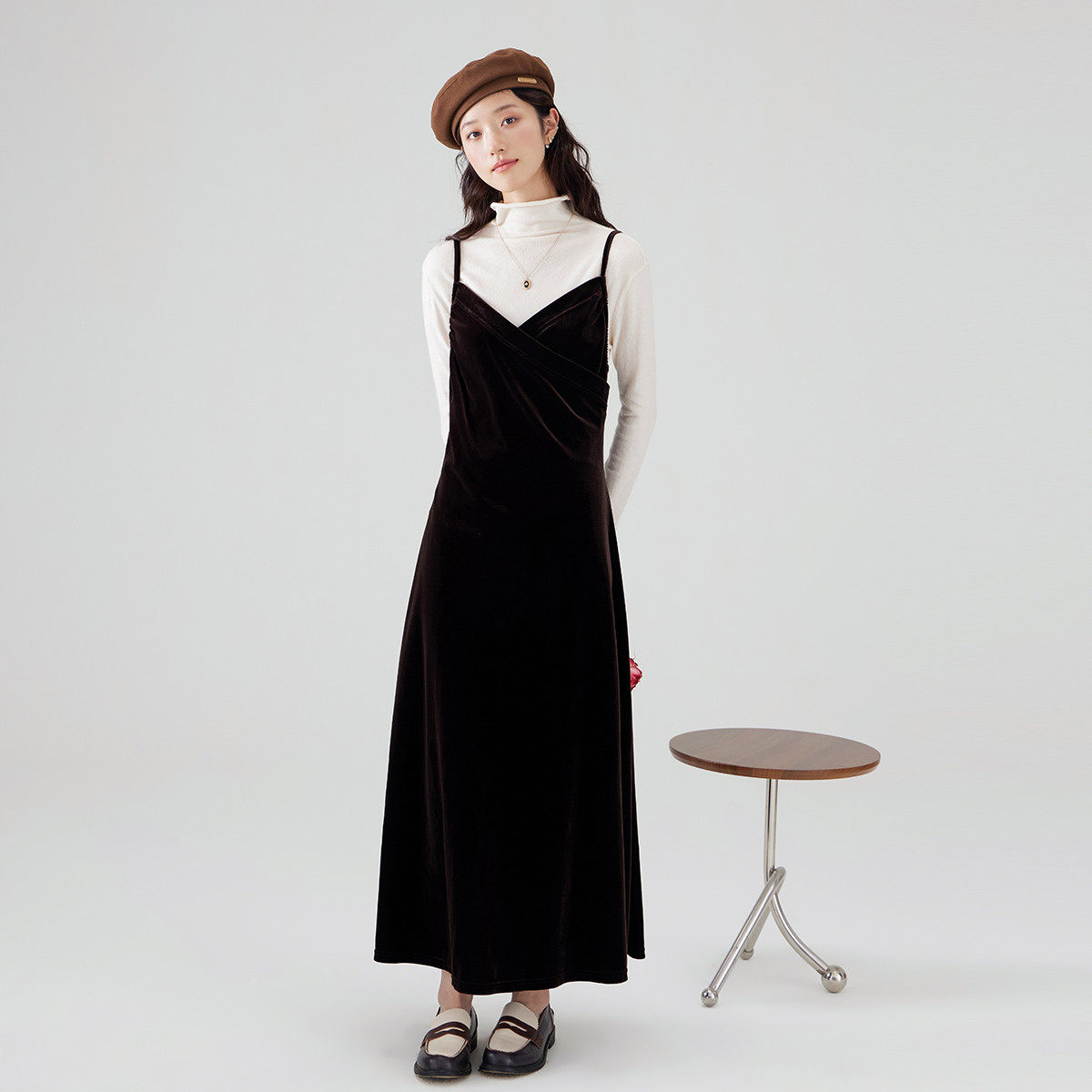 one more吊带丝绒连衣裙女2025初秋外穿美拉德长裙v领高级礼服裙