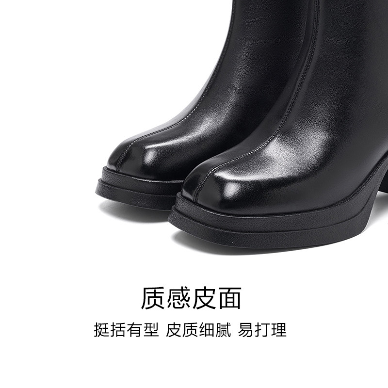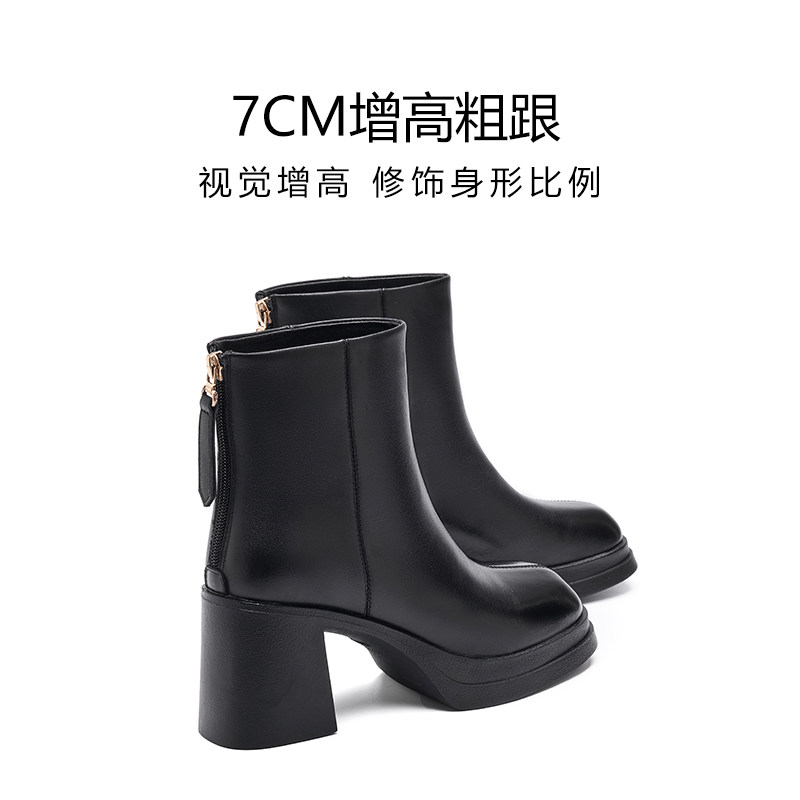 哈森时尚气质真皮时装靴子女2025秋冬新款百搭加绒粗高跟短筒女靴