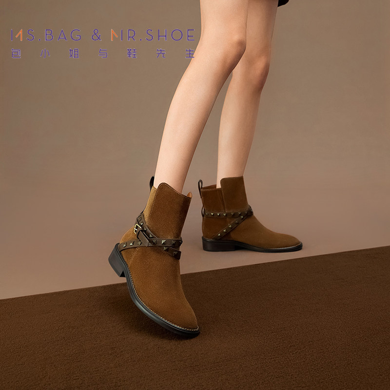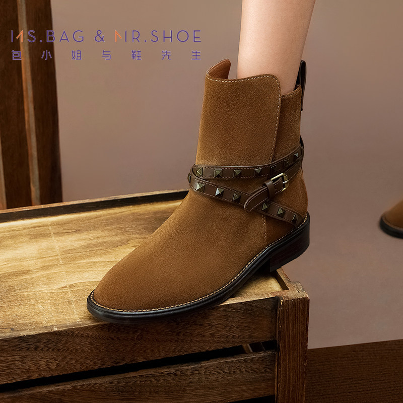 包小姐与鞋先生秋冬坚果棕条带铆钉低跟西部靴女244180