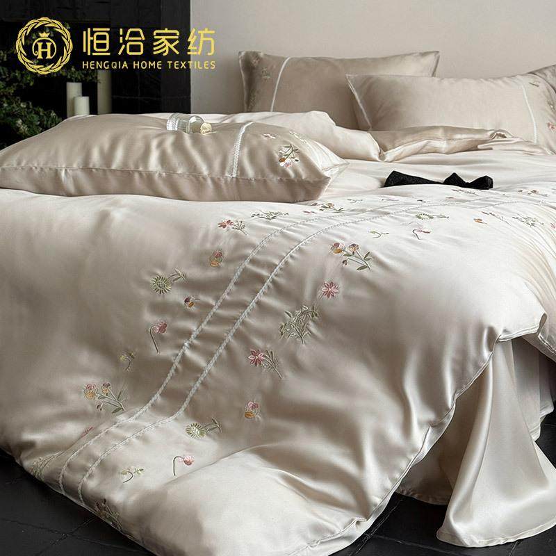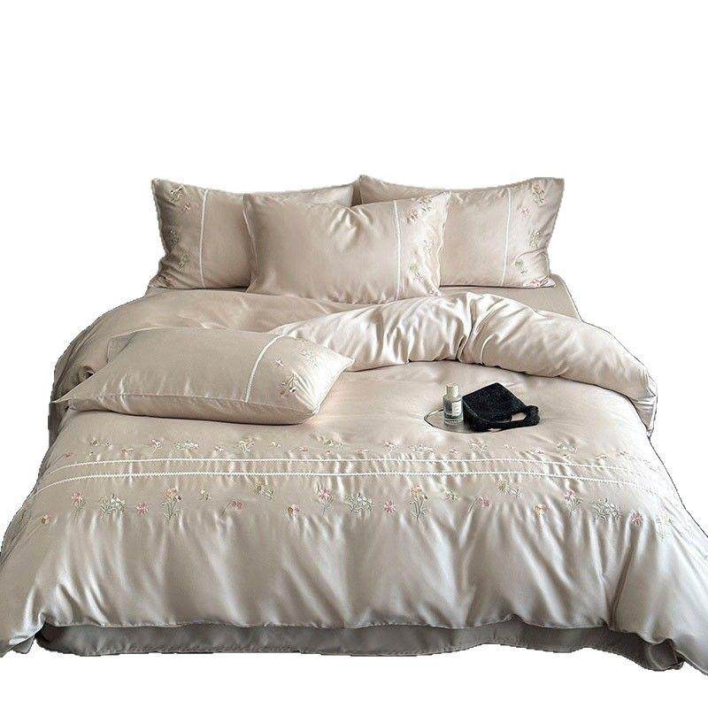 夏季高端莱赛尔纤维四件套花卉刺绣凉感裸睡被套床品1.2床笠咖色