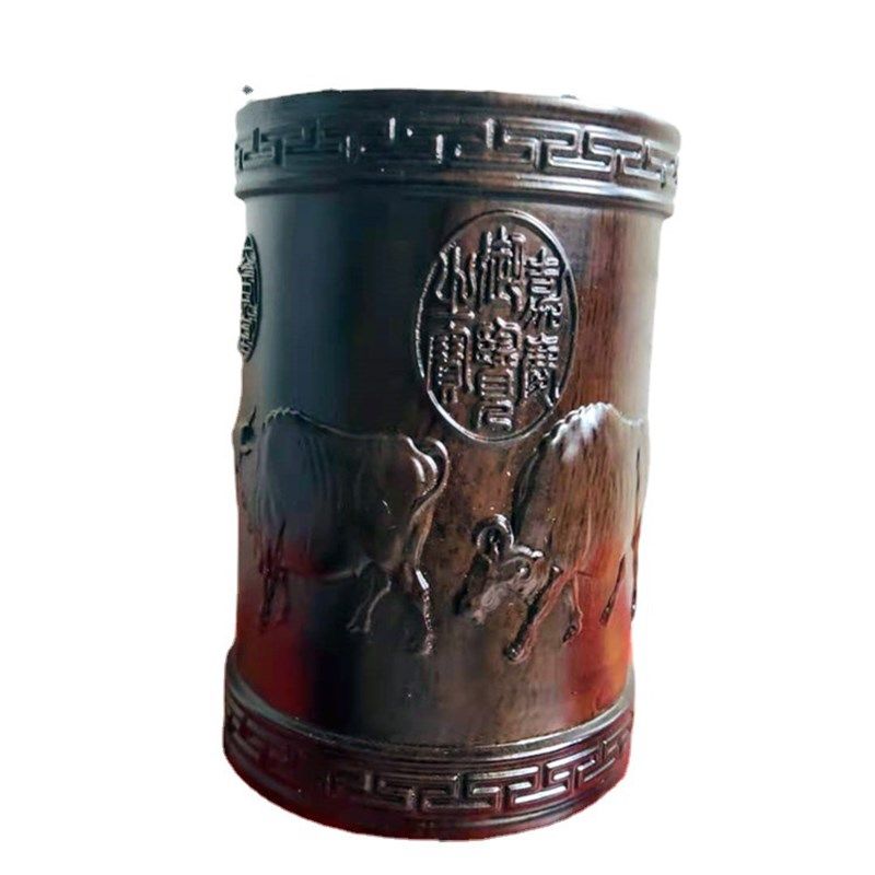 红木浮雕刻笔筒工艺摆饰木雕刻实木黑檀木质喜上T眉梢办公室笔筒