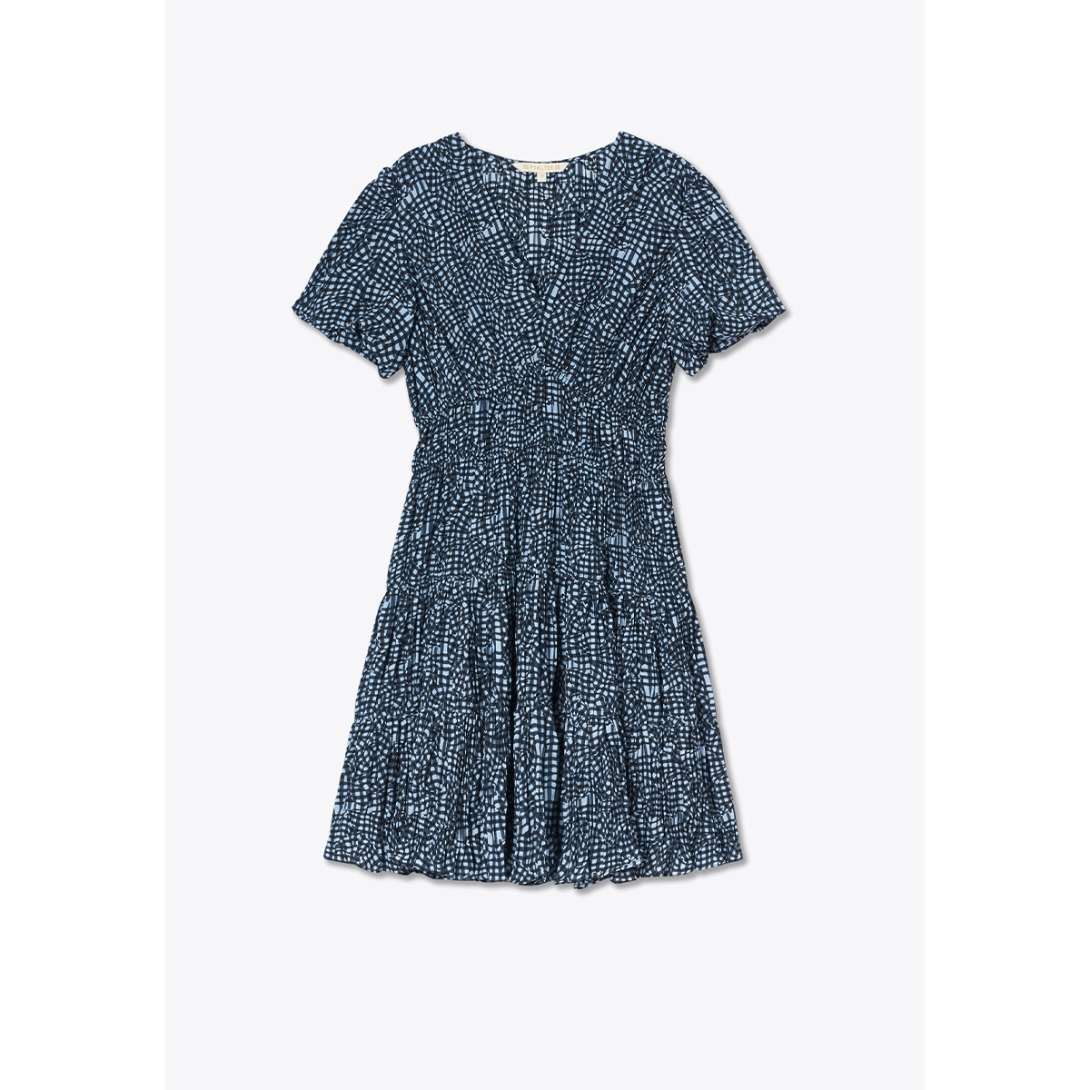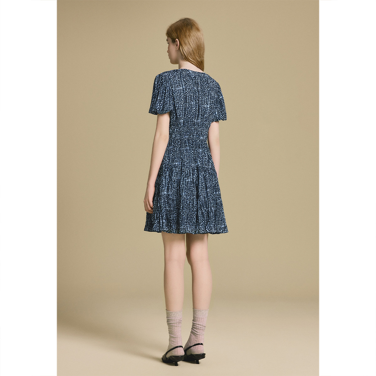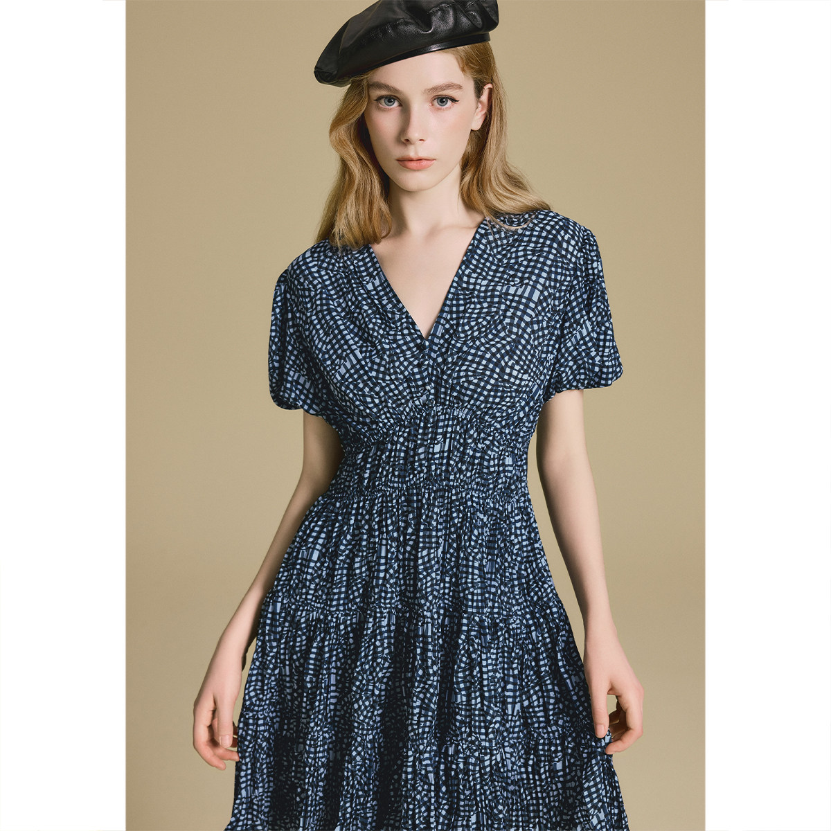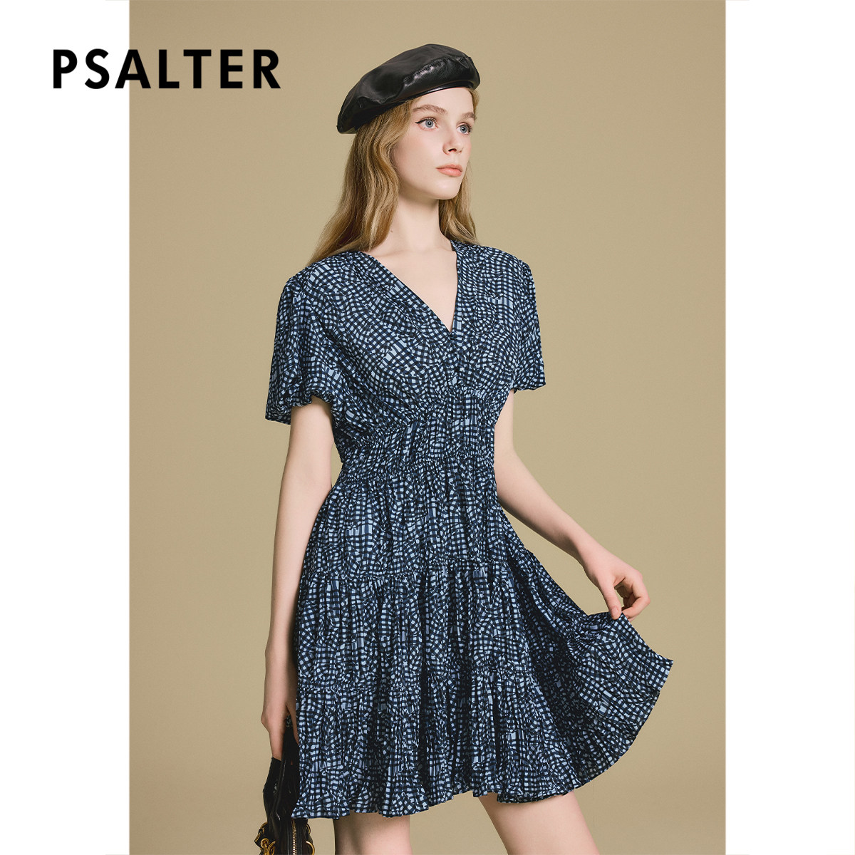 诗篇专选法式V领收腰修身立体褶裥印花连衣裙2025秋款