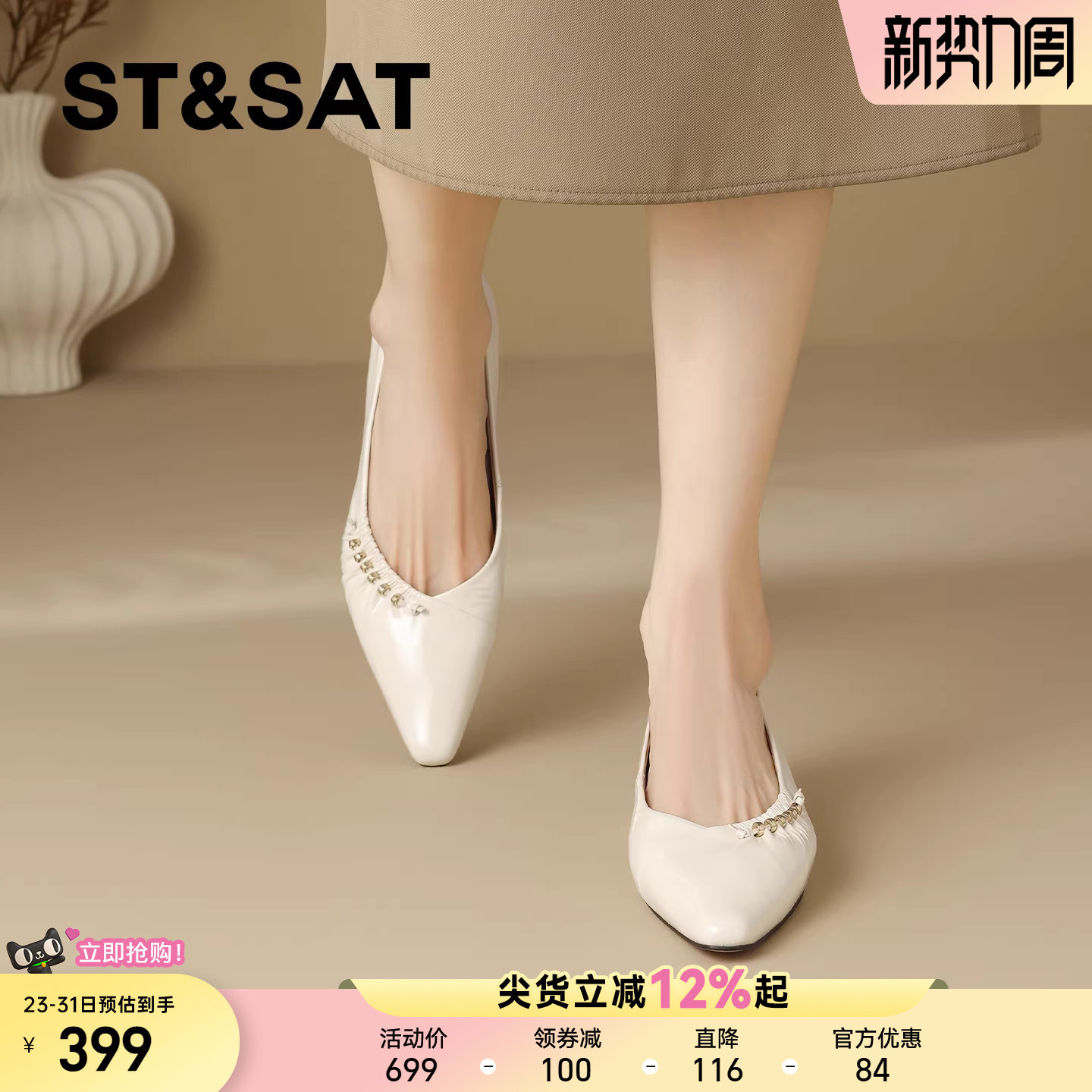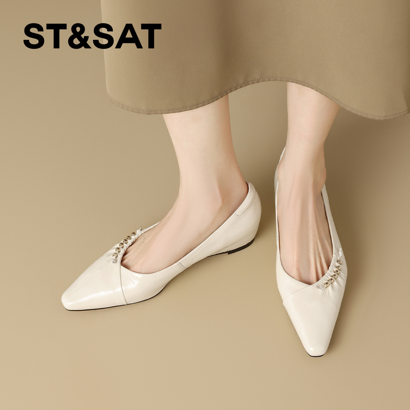 星期六真皮坡跟褶皱工作鞋女2026春季新款方头内增高浅口单鞋