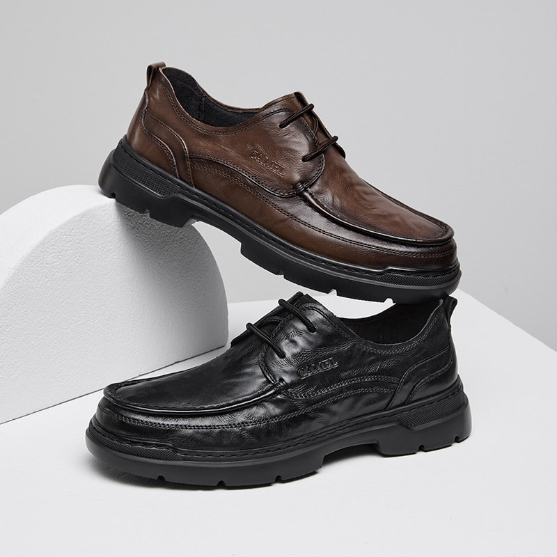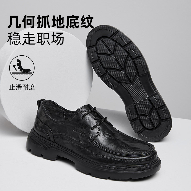 免开胶真皮休闲皮鞋男款软皮厚底增高透气商务系带平底缝线德比鞋