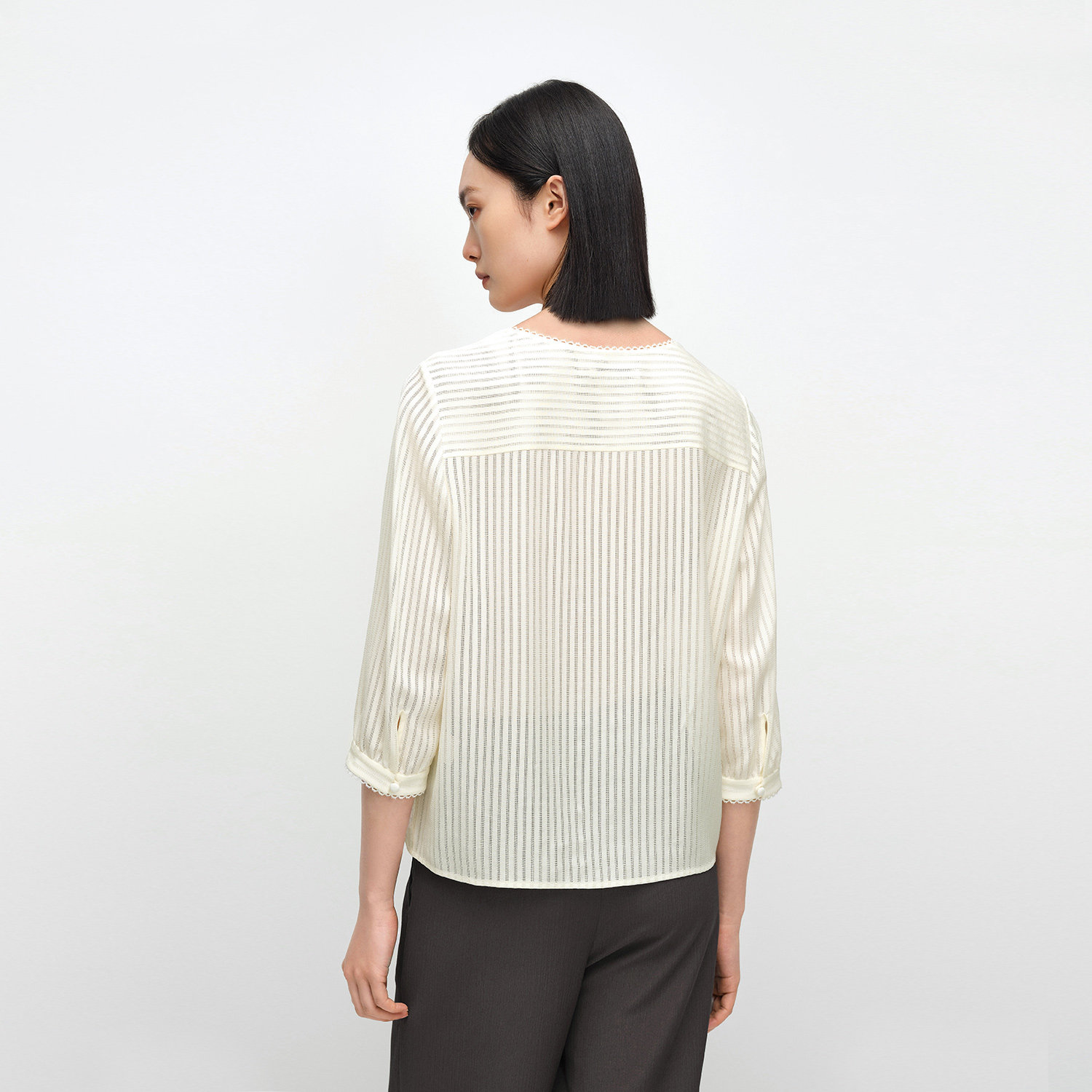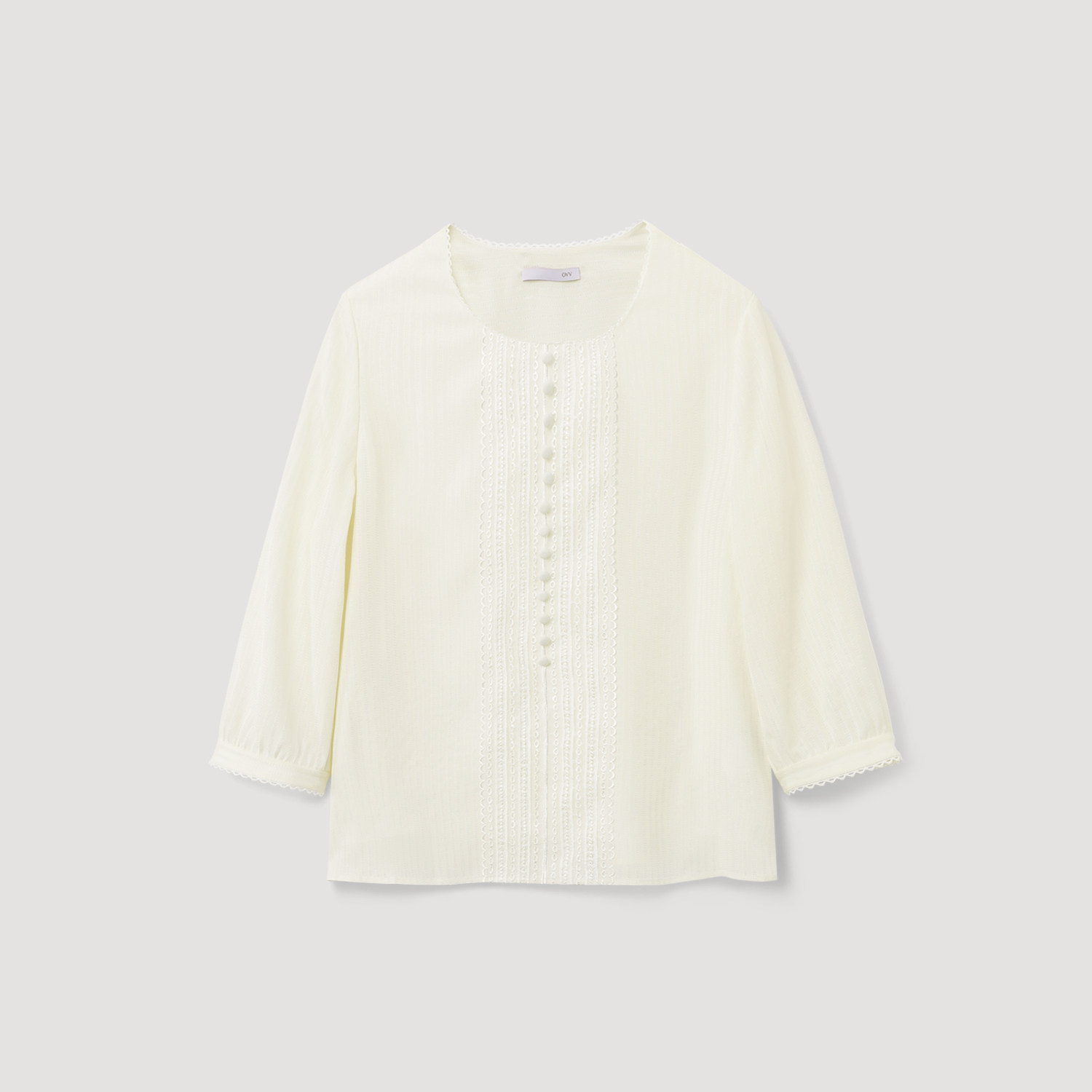 OVV2025春夏新款女装淡人清爽条纹圆领设计蕾丝花边真丝休闲衬衫