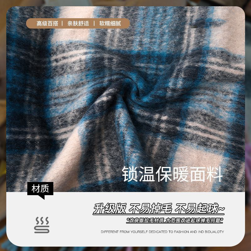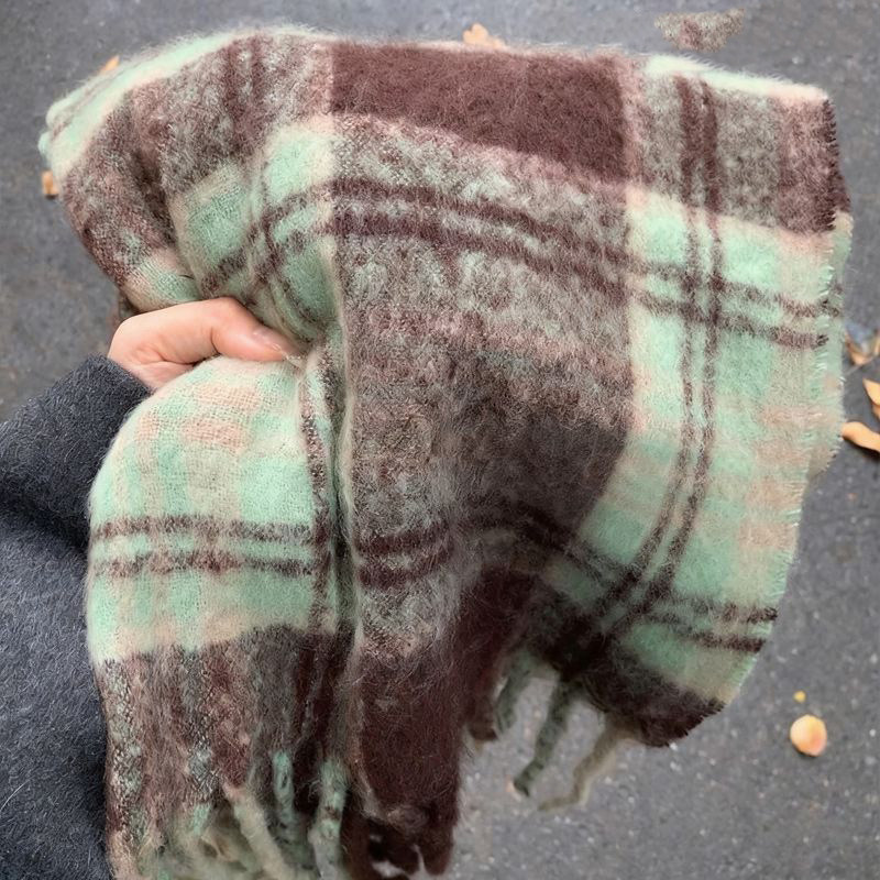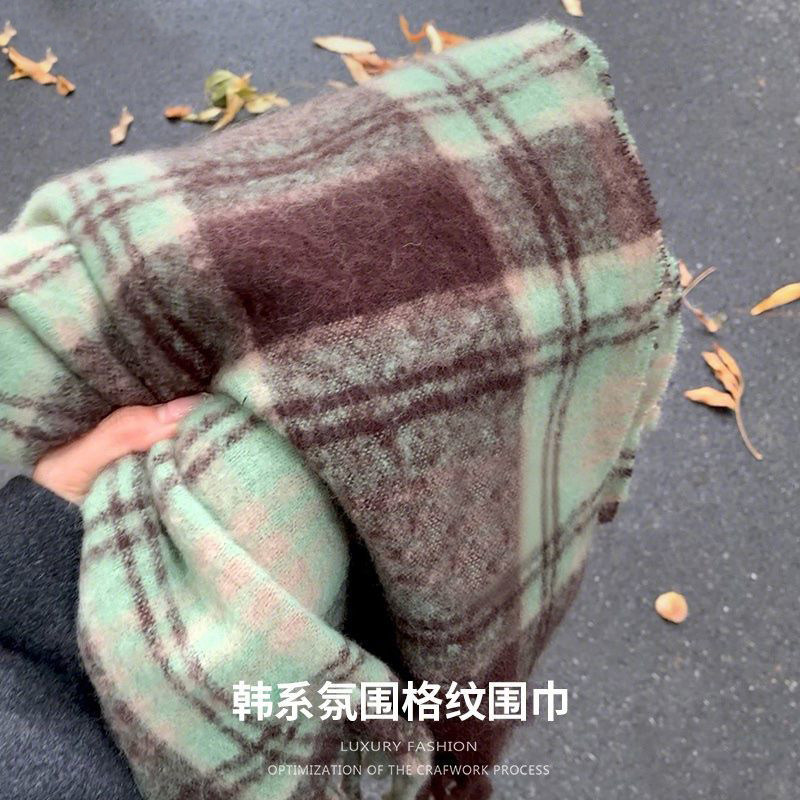薄荷绿保暖围巾高级感女冬季格子氛围感护肩韩系绿色外套大衣紫色