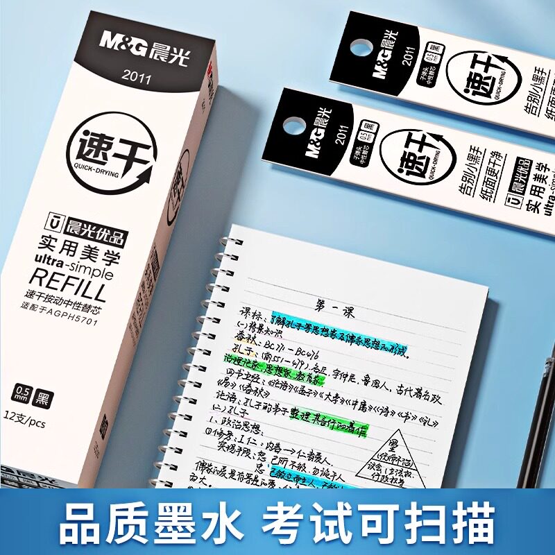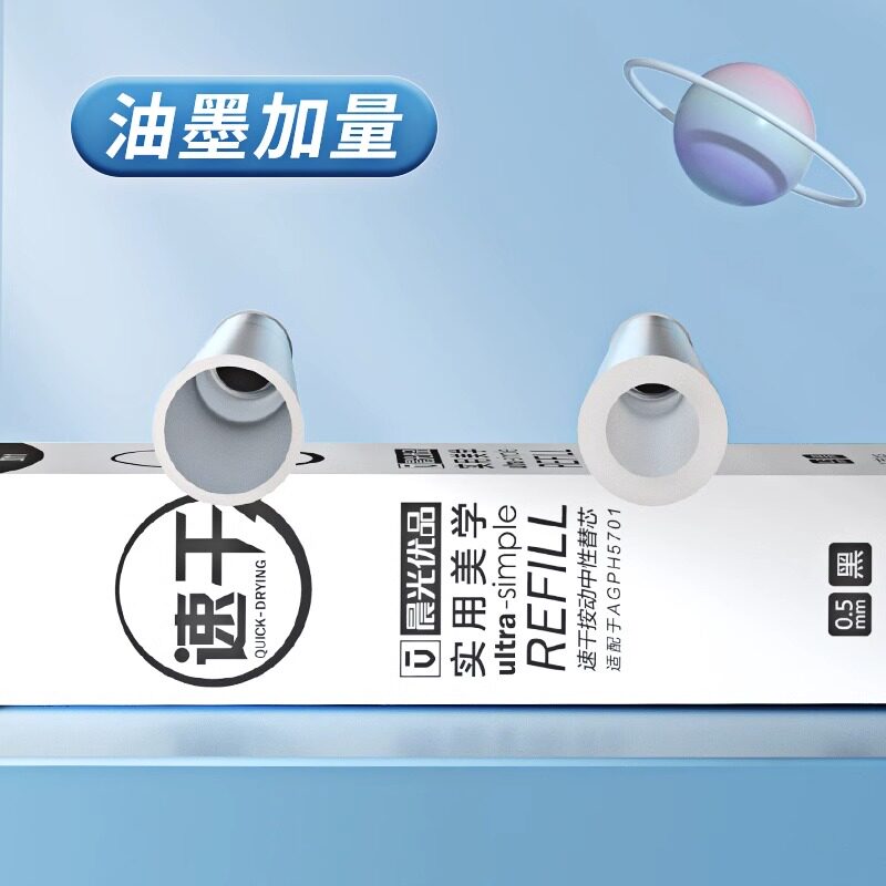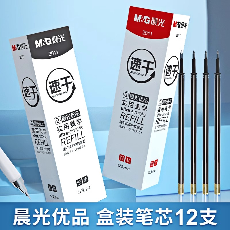 晨光优品速干按动笔芯0.5mm黑色子弹头水笔按动中性笔替芯st笔头碳素黑2011按动中性笔芯实用美学全针管整盒