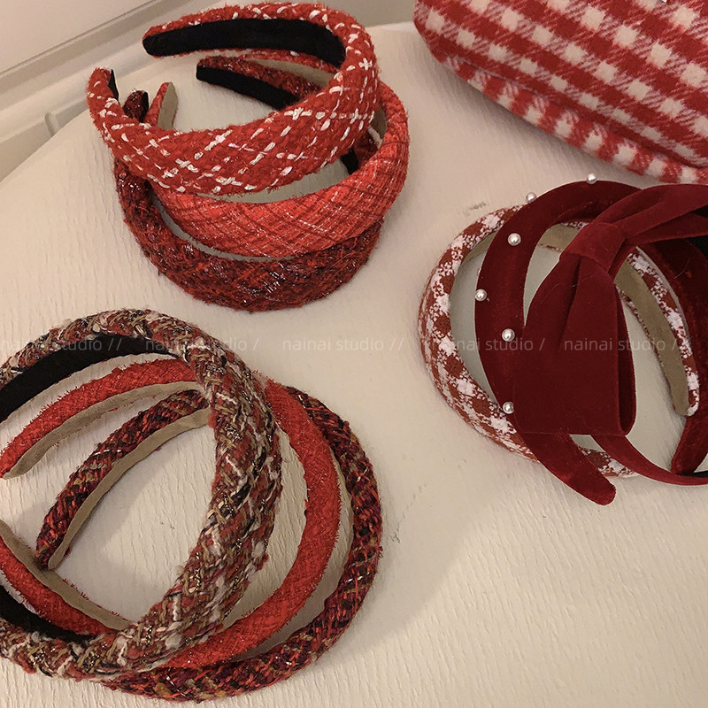 红色发箍~新年小香风粗花呢高颅顶格纹头箍秋冬高级感发饰头饰潮
