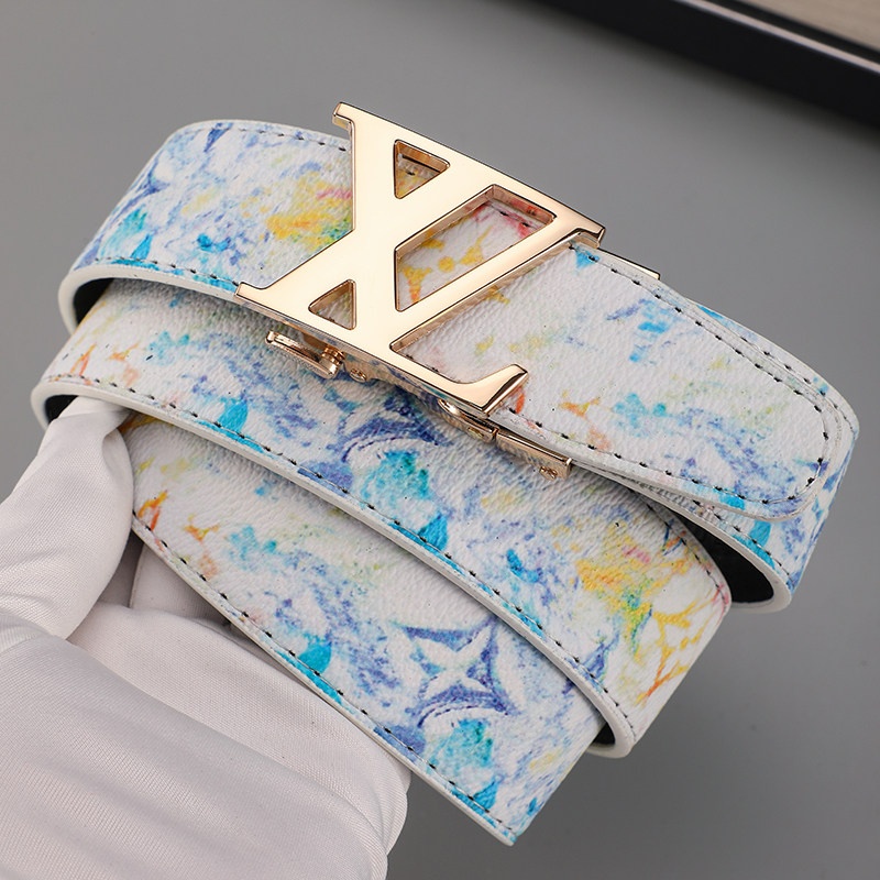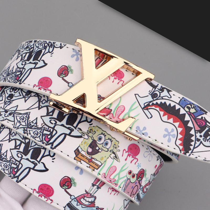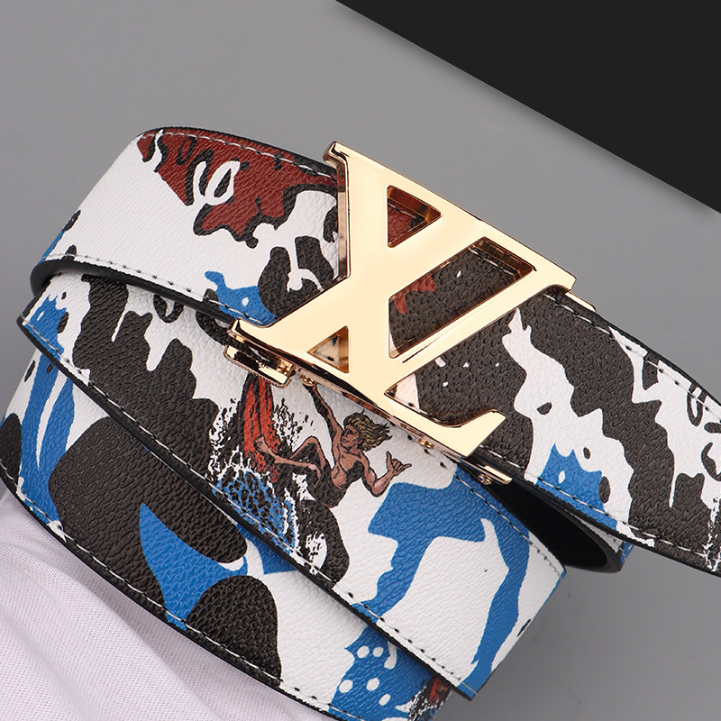 新款时尚男士皮带真皮休闲百搭字母涂鸦自动扣腰带牛仔裤潮流网红