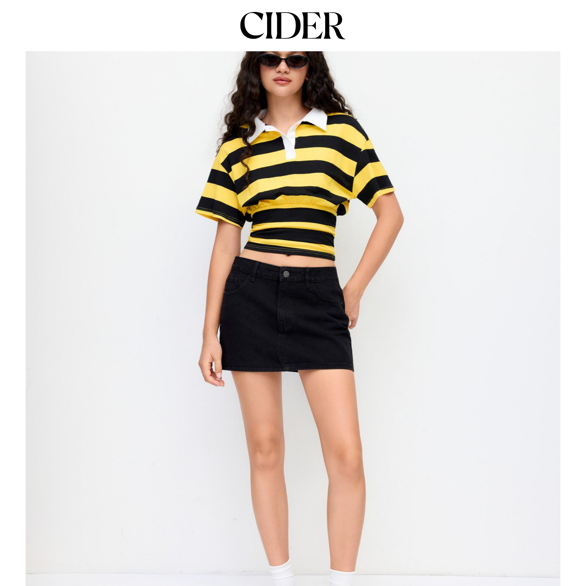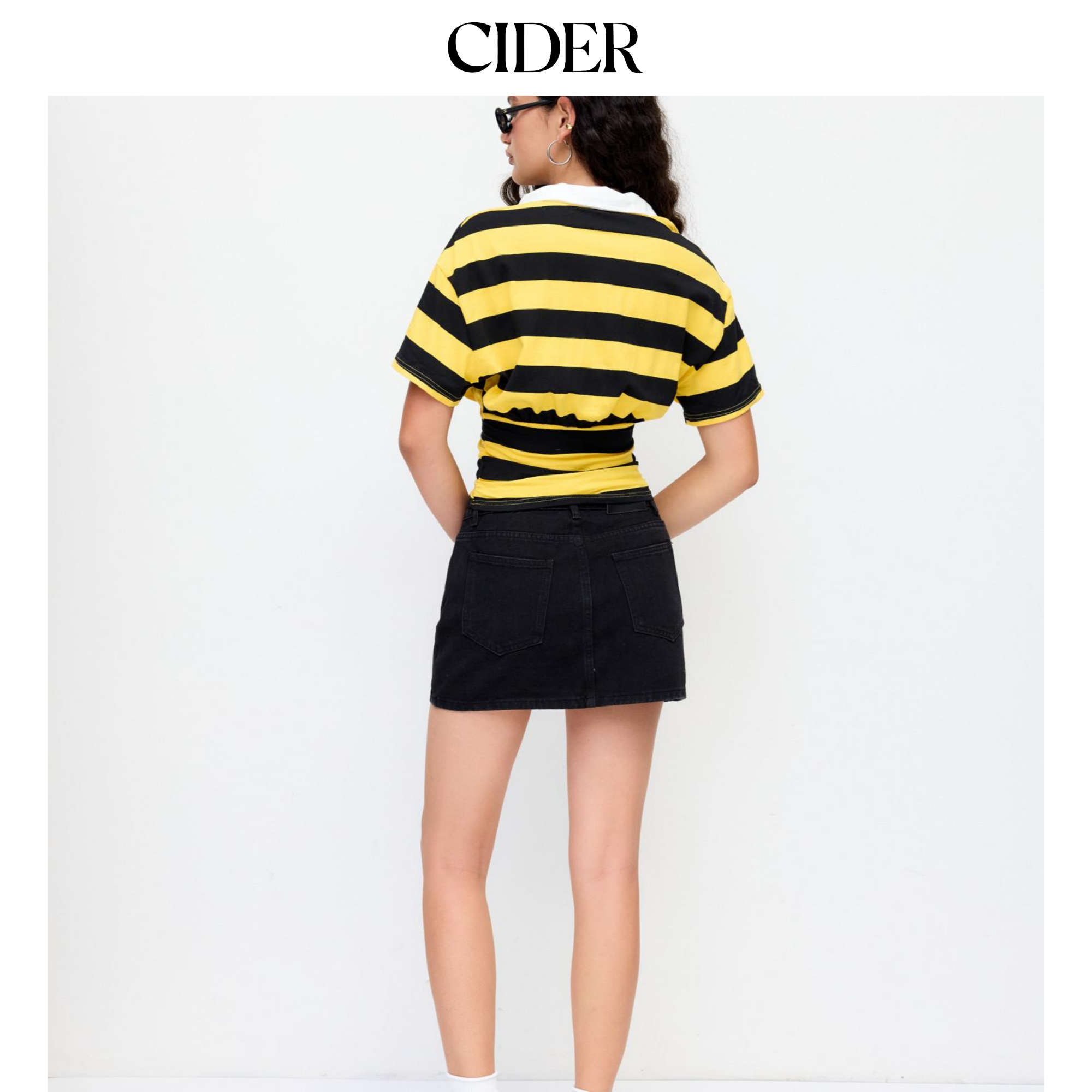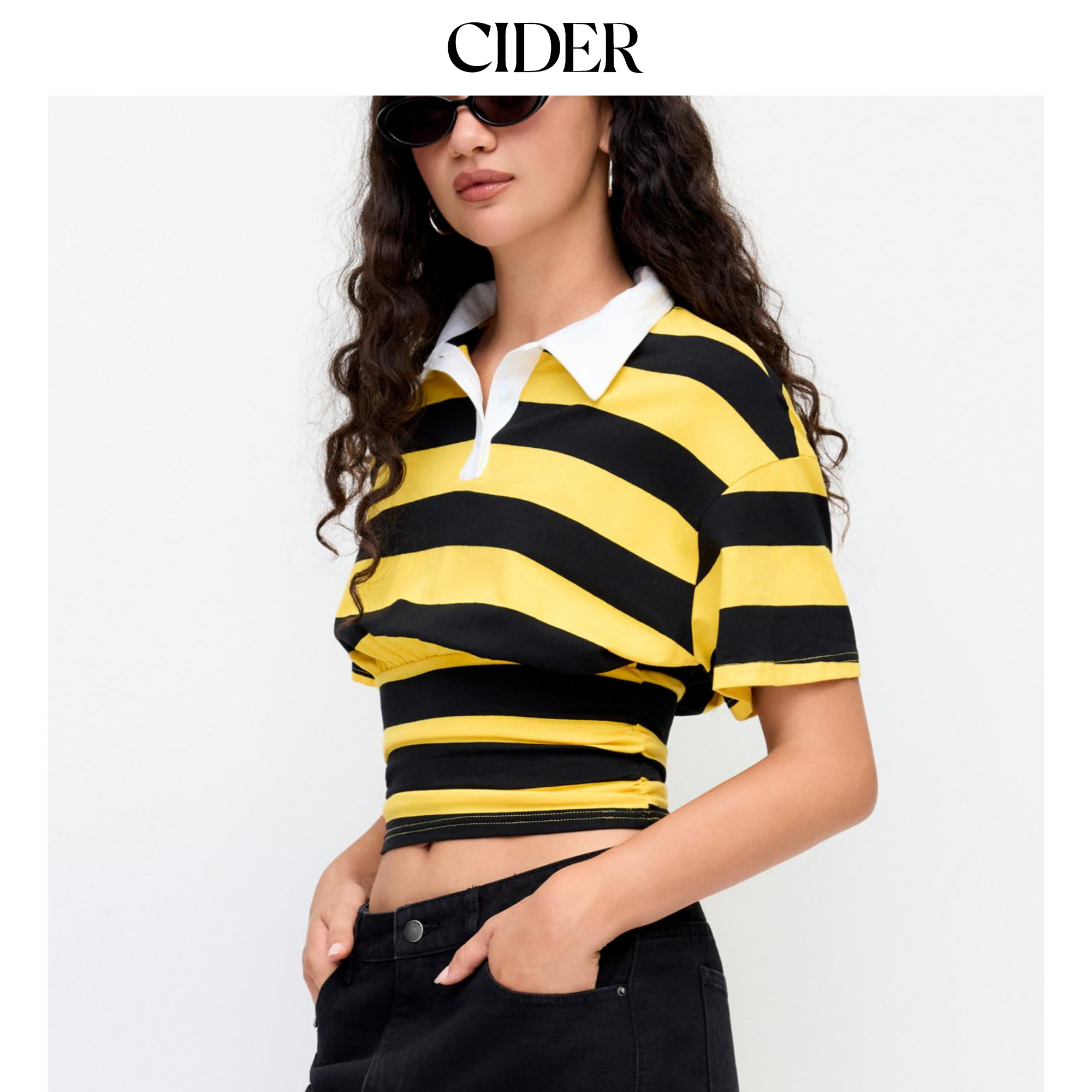 【明星同款】CIDER 正品条纹T恤翻领收腰短袖T恤114710518