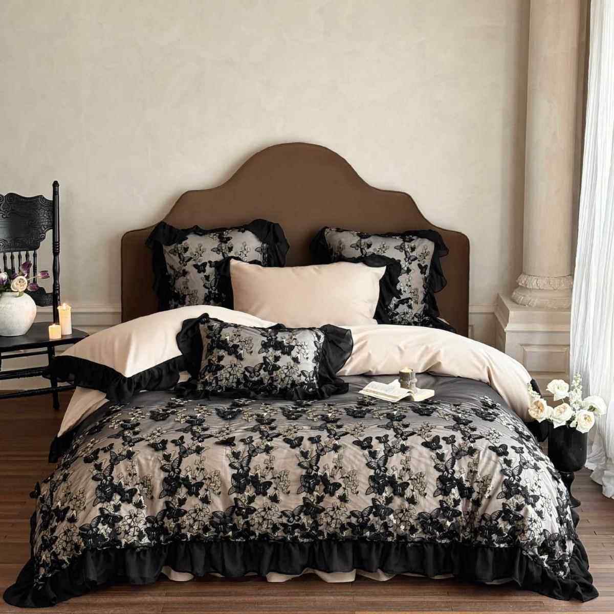 法式风全棉水洗棉四件套复古蝴蝶刺绣荷叶花边被套床裙款床上用品