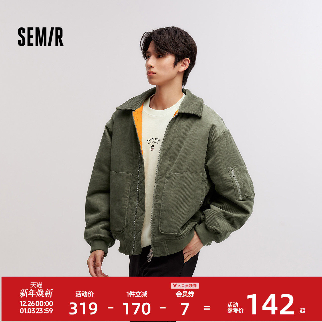 森马棉服男灯芯绒肌理感2024冬季新款飞行员外套厚款夹克oversize