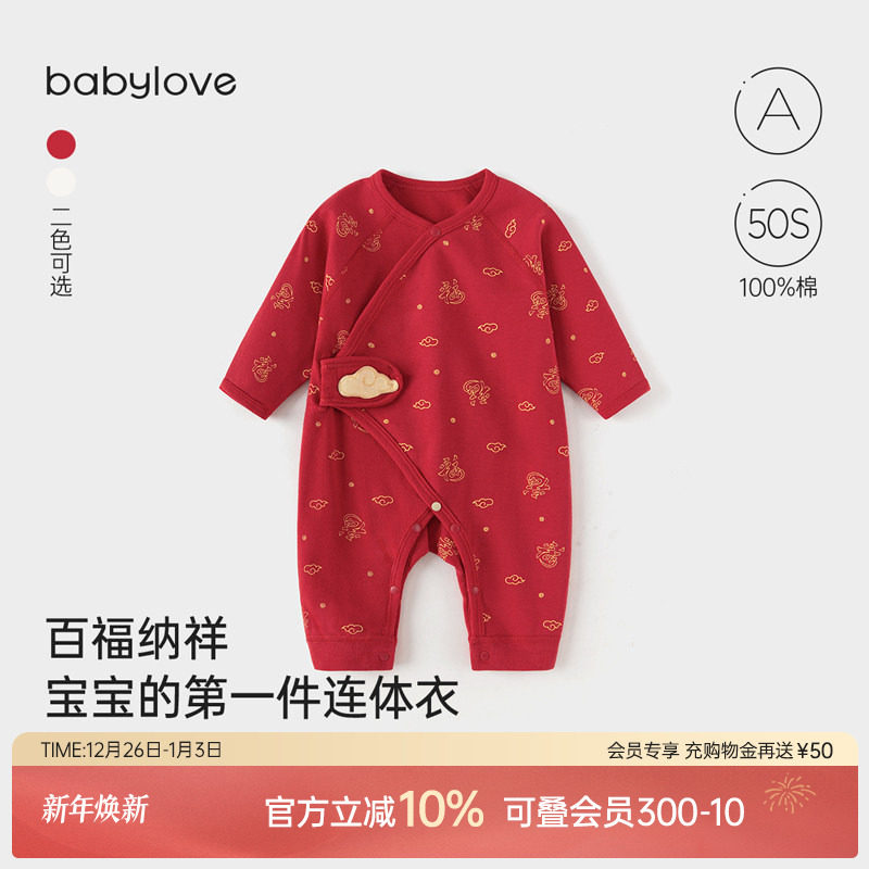 babylove新生儿连体衣秋冬纯棉满月百天宝宝衣服婴儿新年红色哈衣