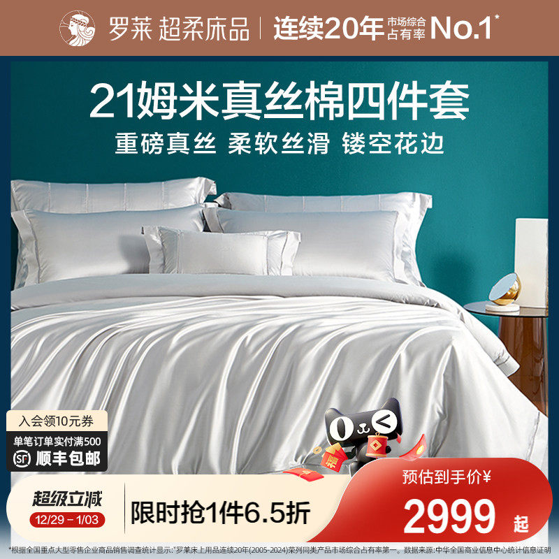 罗莱家纺真丝四件套桑蚕丝棉床单被套高端轻奢华大气酒店床上用品