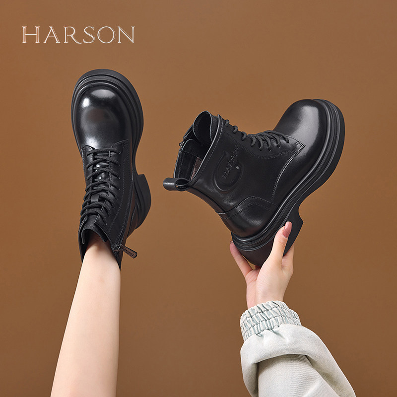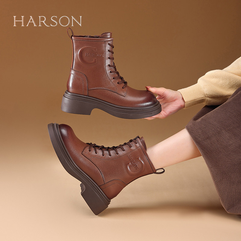 哈森头层牛皮靴秋冬女靴子加绒英伦风复古时尚百搭休闲短靴