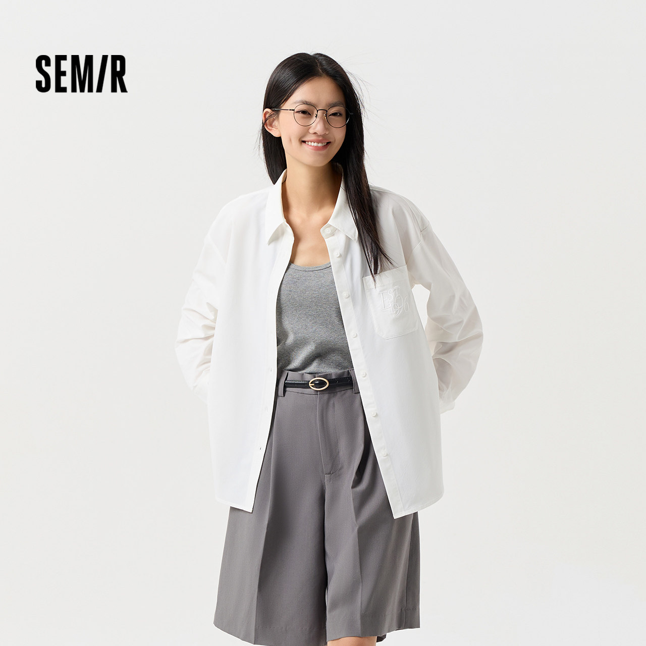 [商场同款]森马长袖衬衫女白色上衣外套2024春季新款刺绣衬衣