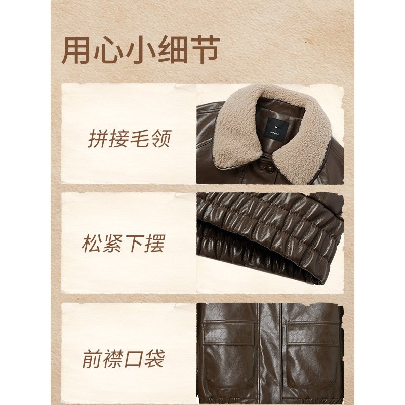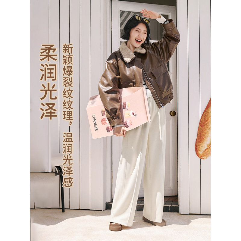 热风2025年冬季新款女士都市经典港风爆裂纹仿皮外套拼接夹克