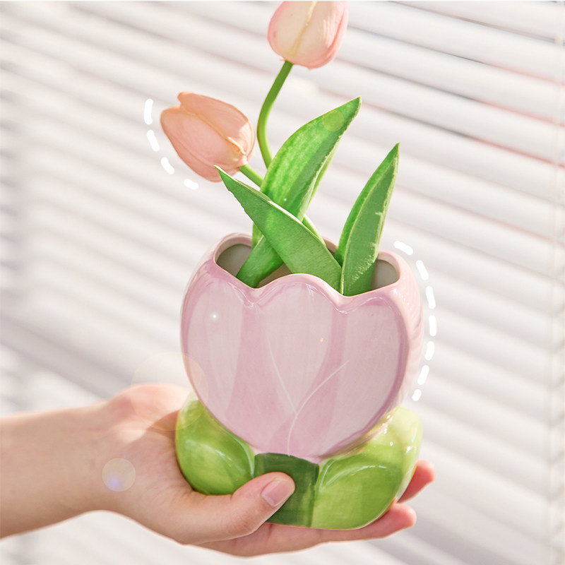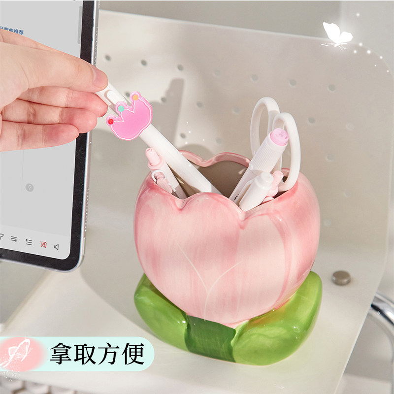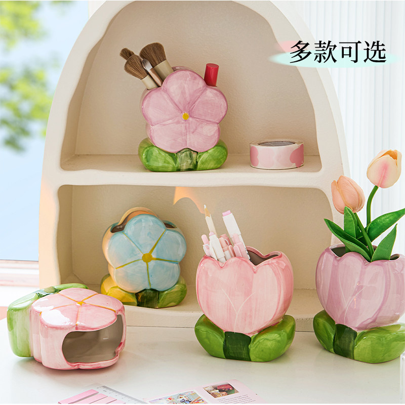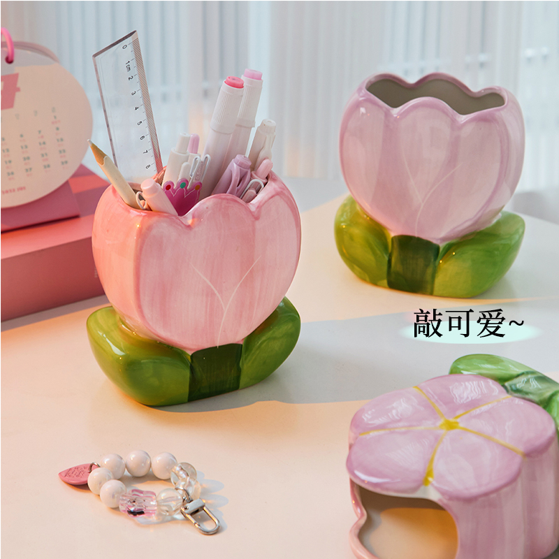 三年二班郁金香笔筒陶瓷桌面大容量可爱女生笔架化妆刷文具置物架学生创意摆件高颜值ins办公室桌面摆件K