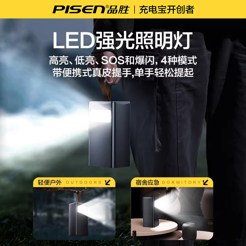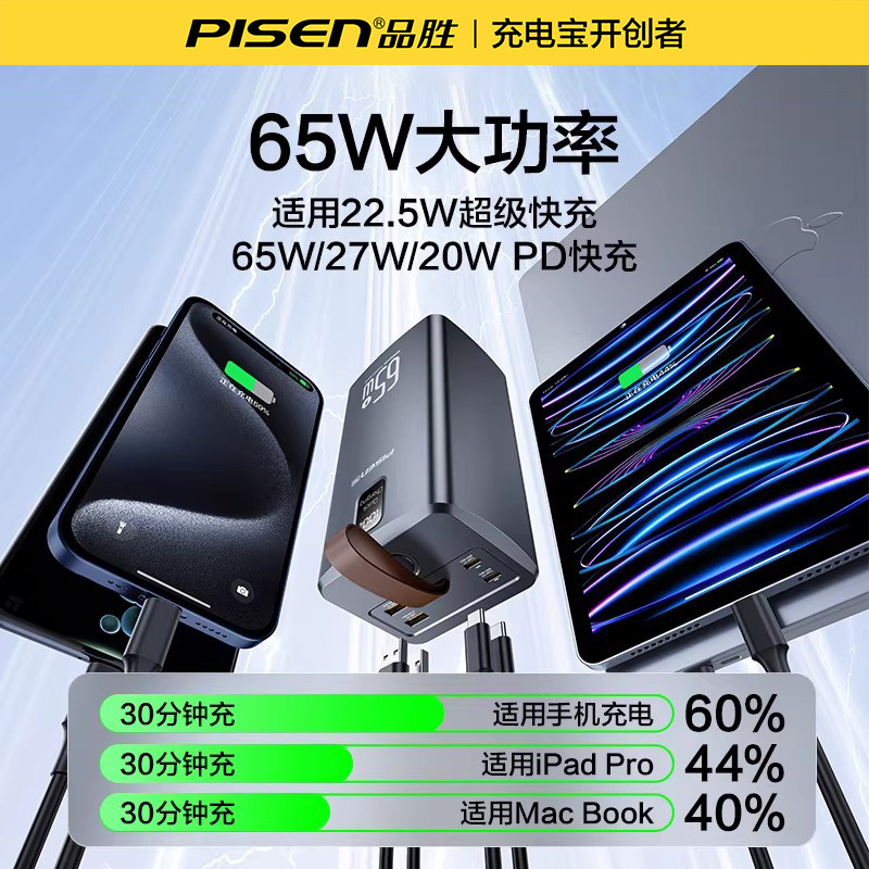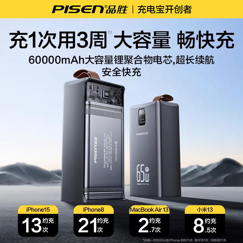 【3c认证】品胜65W充电宝60000毫安超级快充6万超大容量挂绳带灯露营户外电源适用华为小米苹果笔记本3C认证