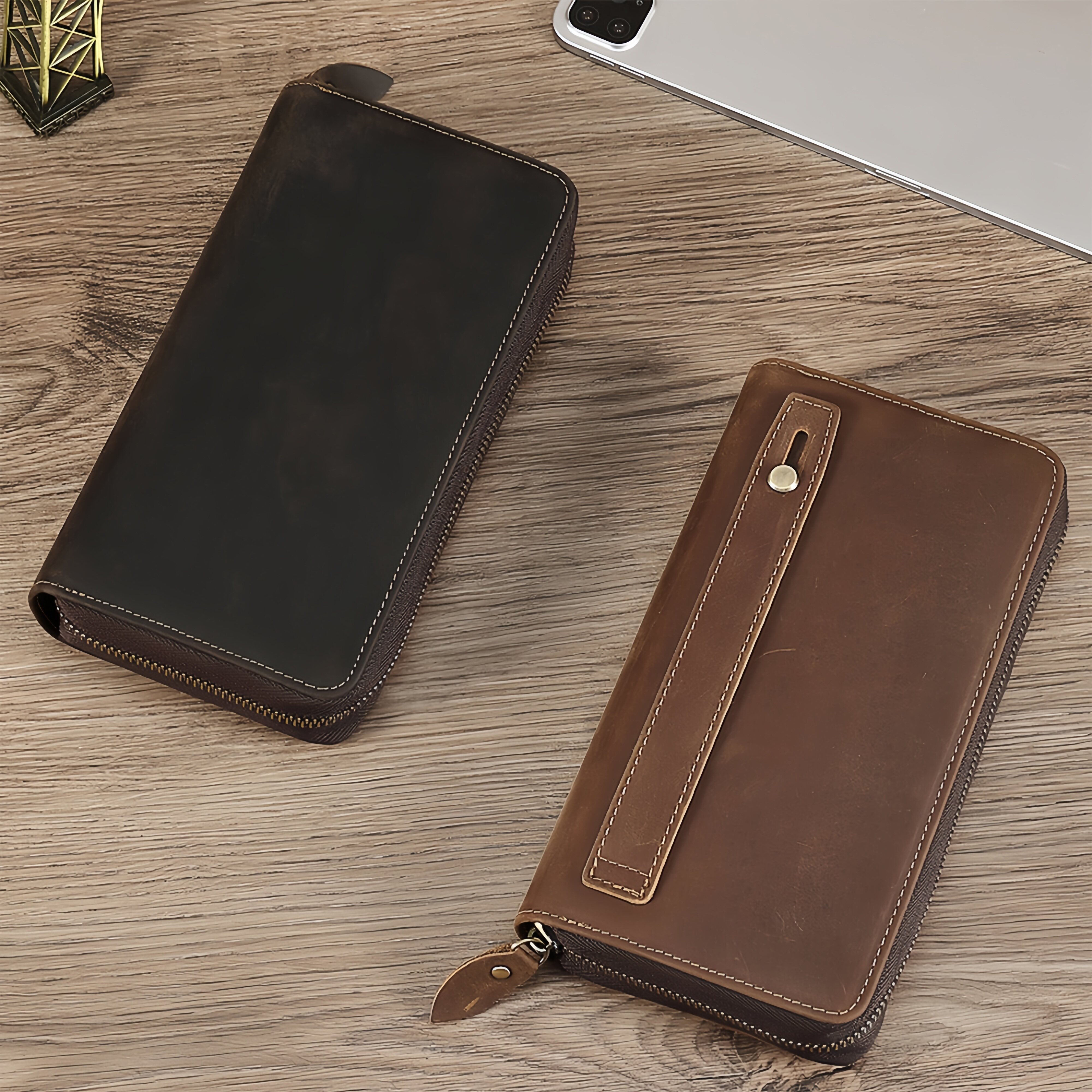真皮男士手拿包手机包防盗刷消磁大容量收纳疯马皮棕色复古长款手抓包商务拉链皮夹钱包屏蔽NFC/RFID扫描咖色