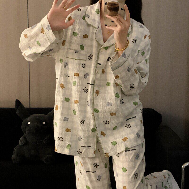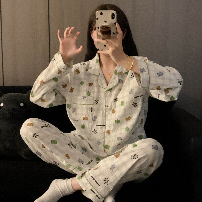 安比斯情侣睡衣舒适纯棉秋季女长袖男女同款休闲家居服套装可出门