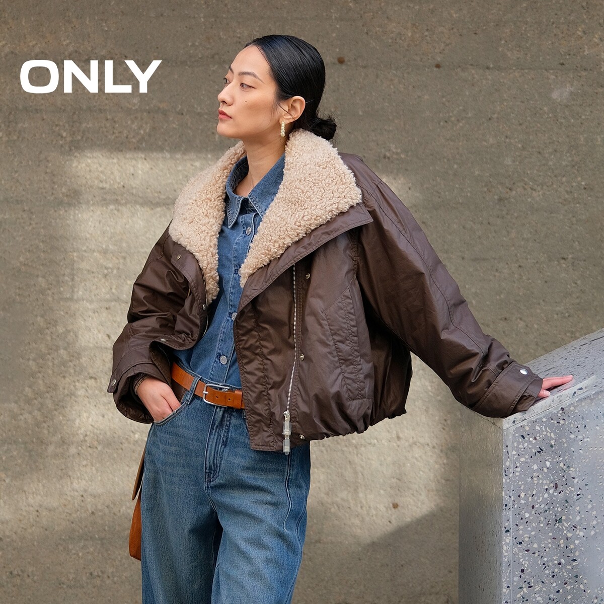 ONLY2025冬季新款90白鸭绒保暖羊羔毛领实用口袋翻领撞色羽绒服女