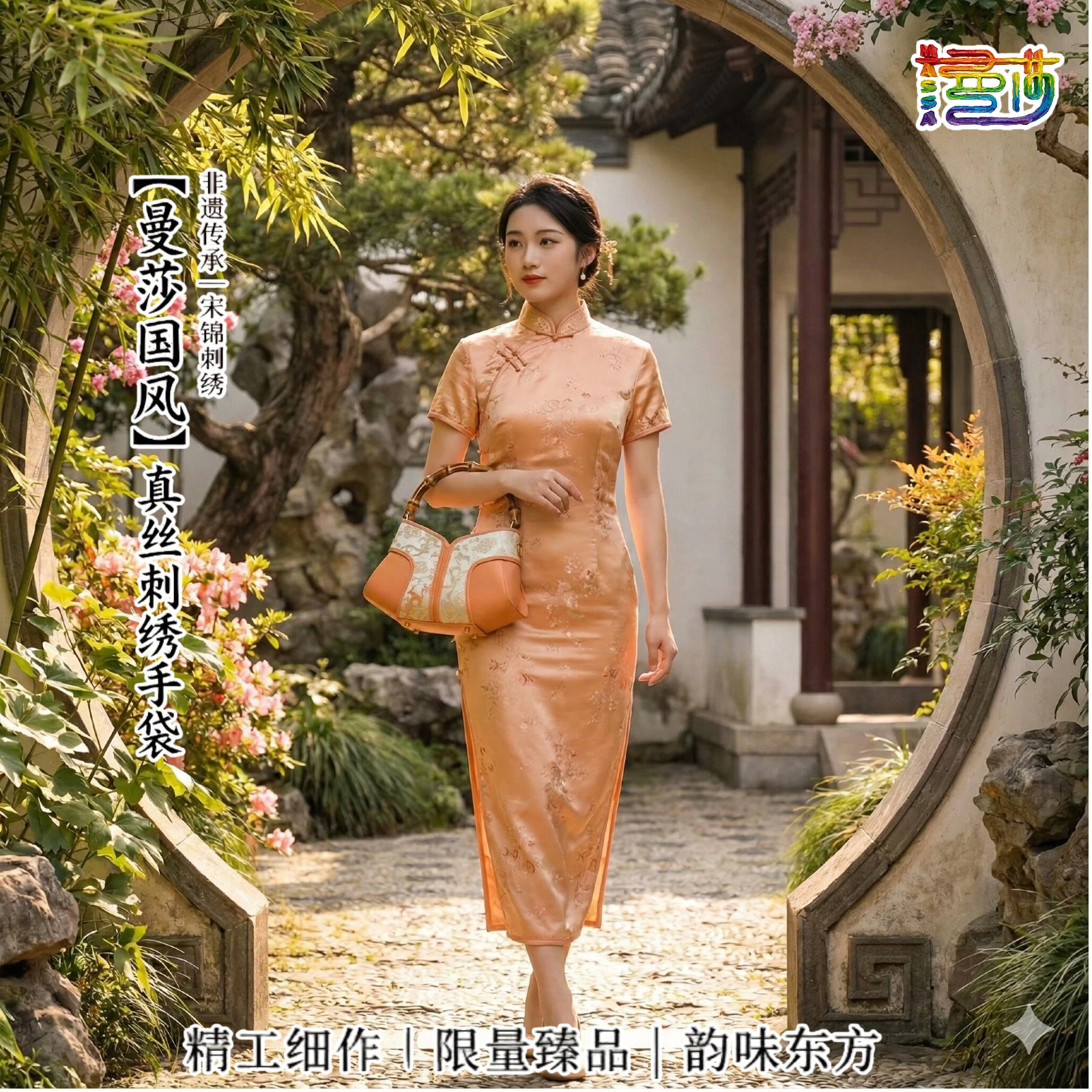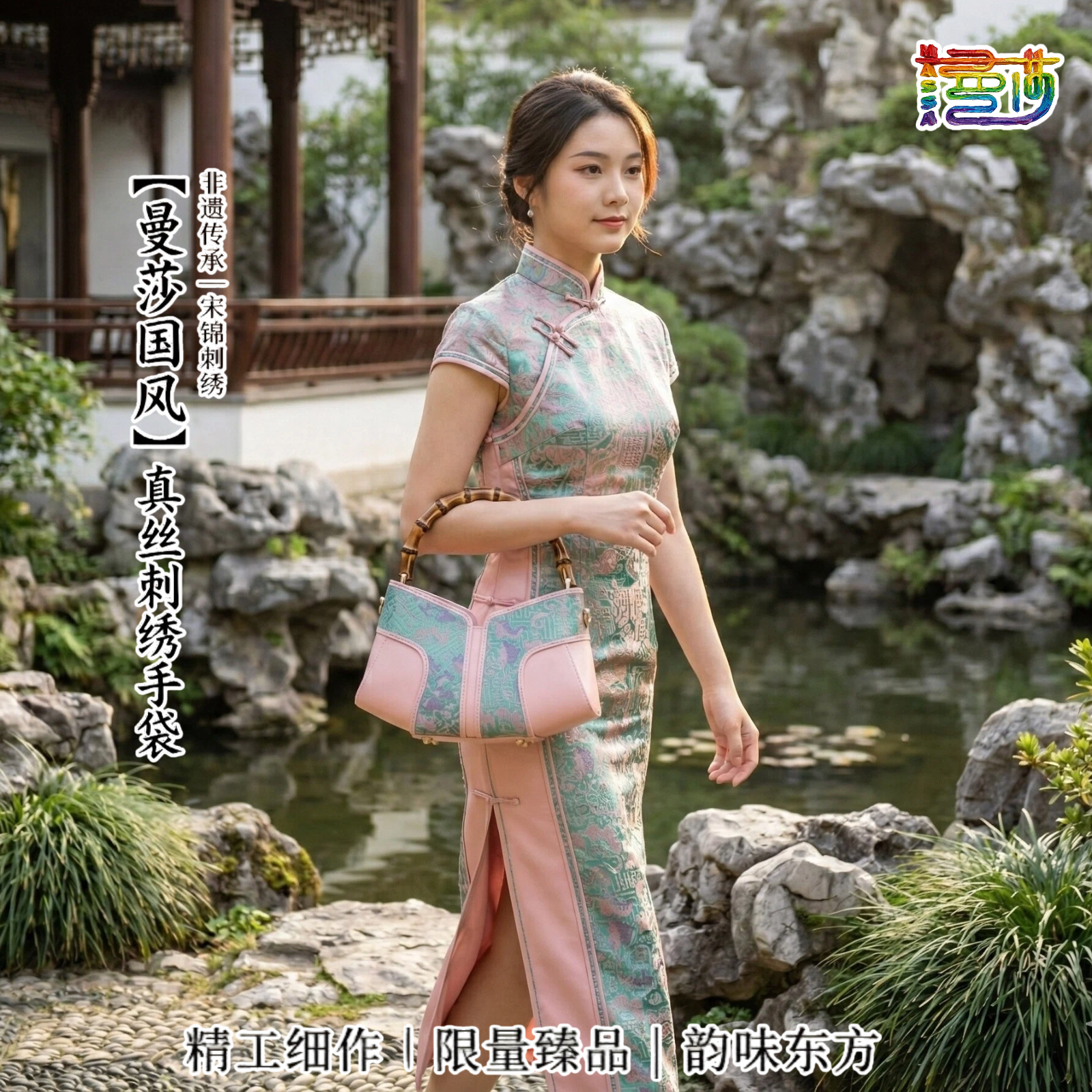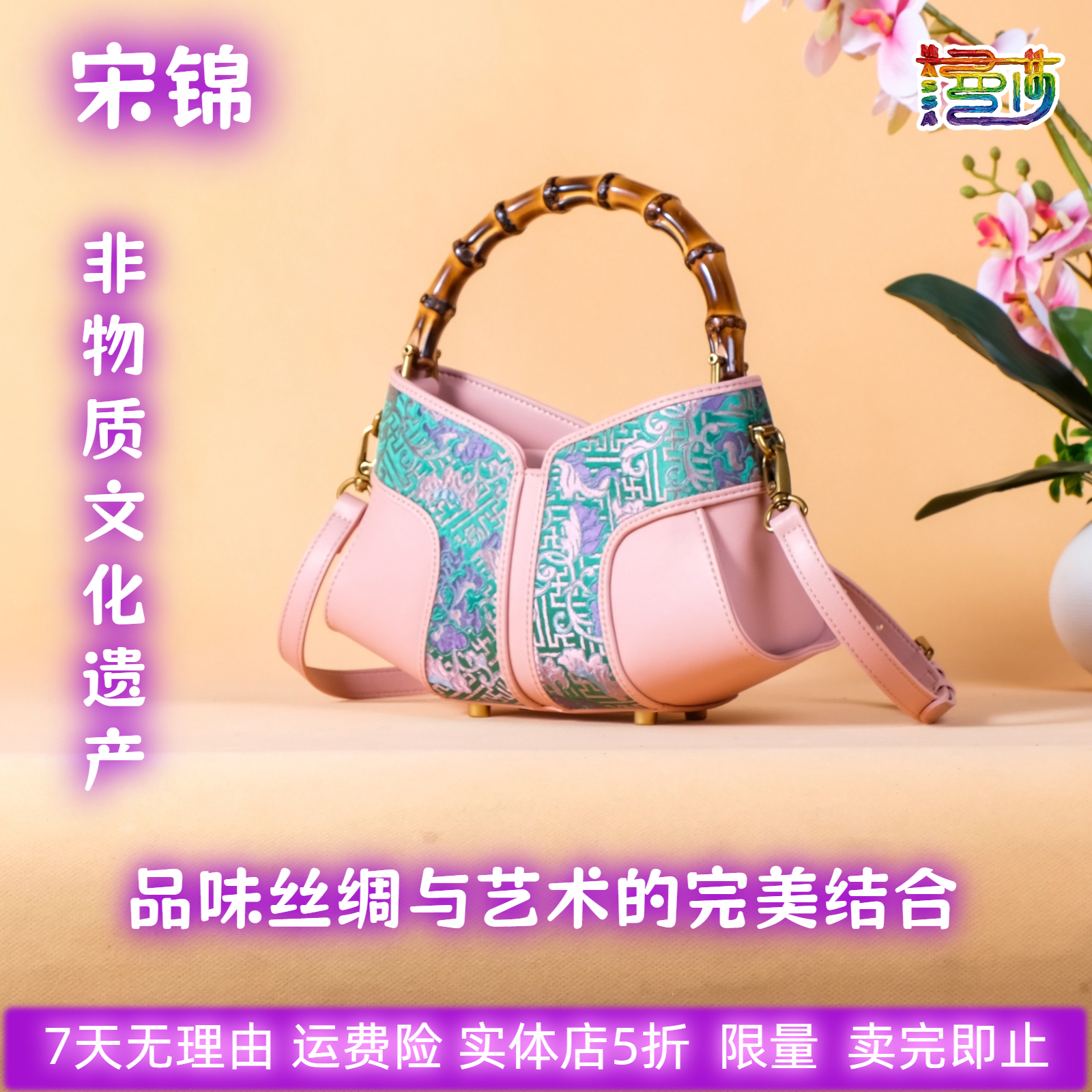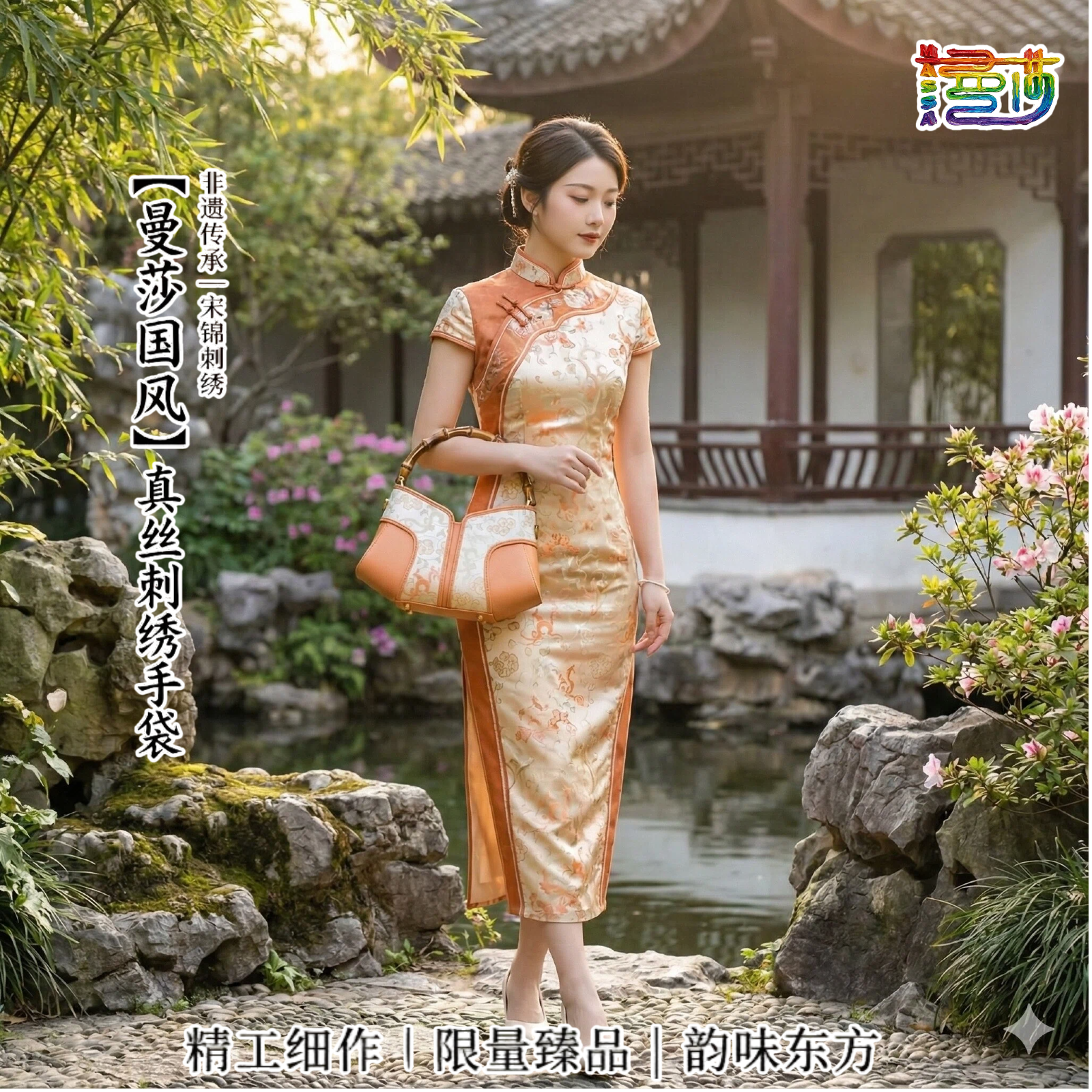 曼莎国风宋锦香云纱手提斜挎刺绣真丝牛皮新款新中式女包旗袍包包