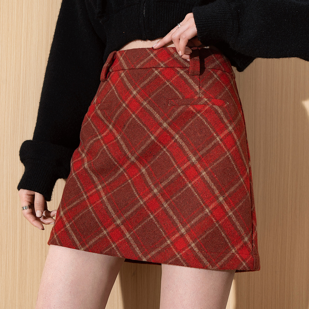 唐狮春秋季新款女半身裙红色格子A字包臀裙毛呢短裙韩系格纹裙TE