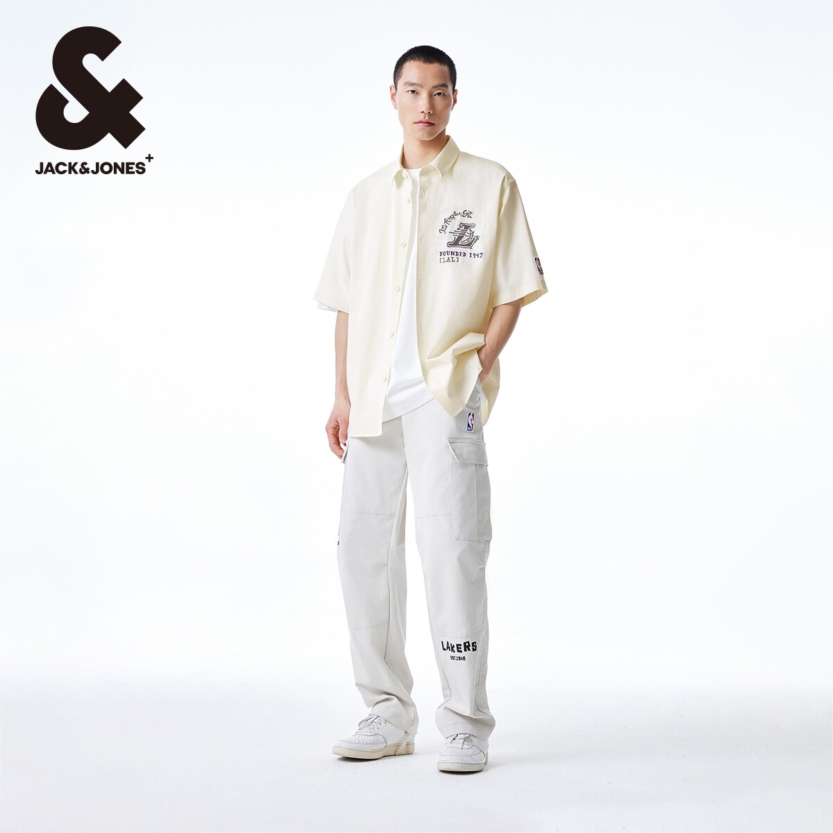 杰克琼斯NBA联名湖人队夏季新款舒适尖领宽松潮满印短袖衬衫男装