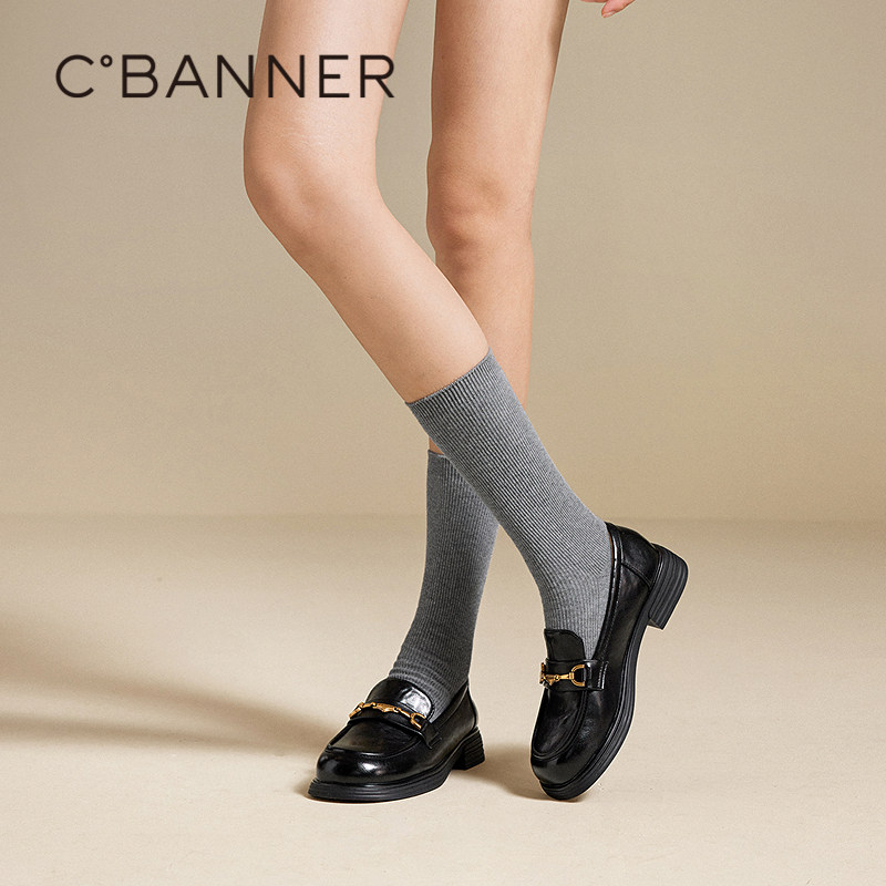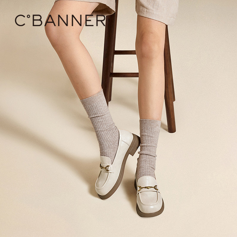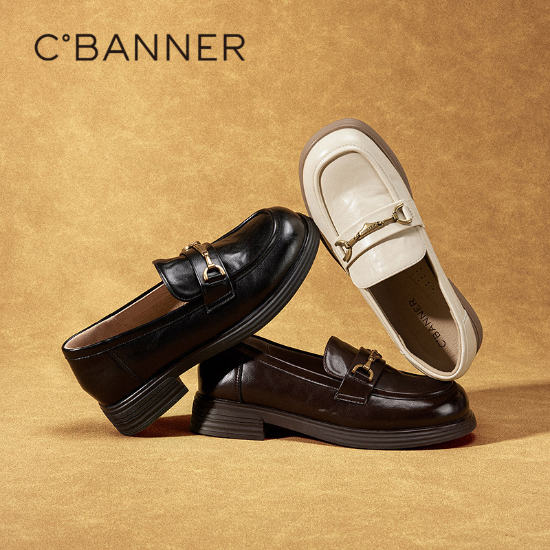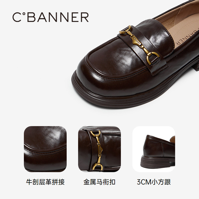 千百度真皮中跟乐福鞋女款2025秋季新款通勤小皮鞋复古深口单鞋