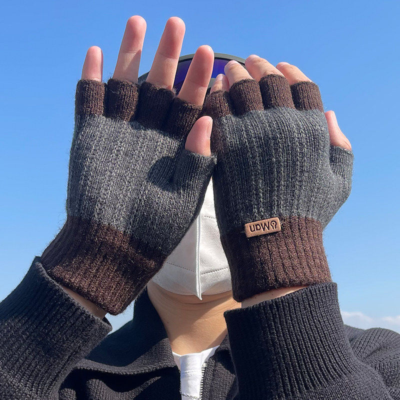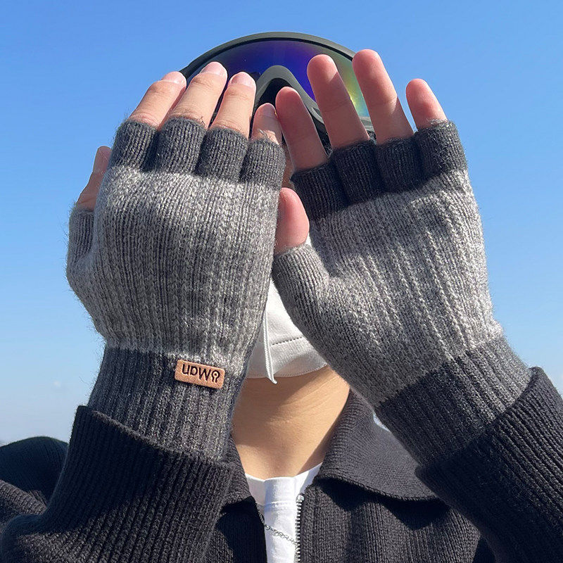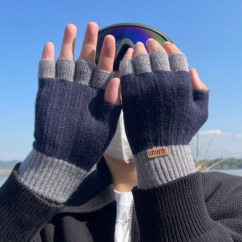 手套半指冬季男露指骑行加厚毛线漏指头学生写字针织保暖半截无指