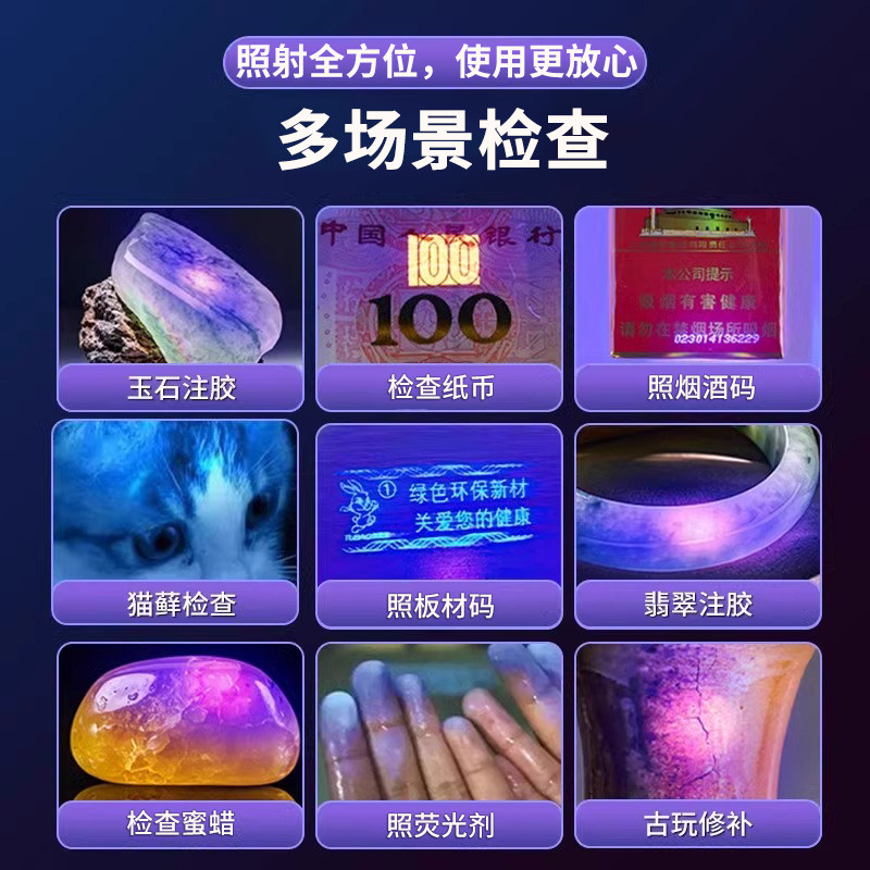 紫光灯鉴定专用紫外线手电筒365nm鉴别翡翠玉石验钞荧光灯笔锂电