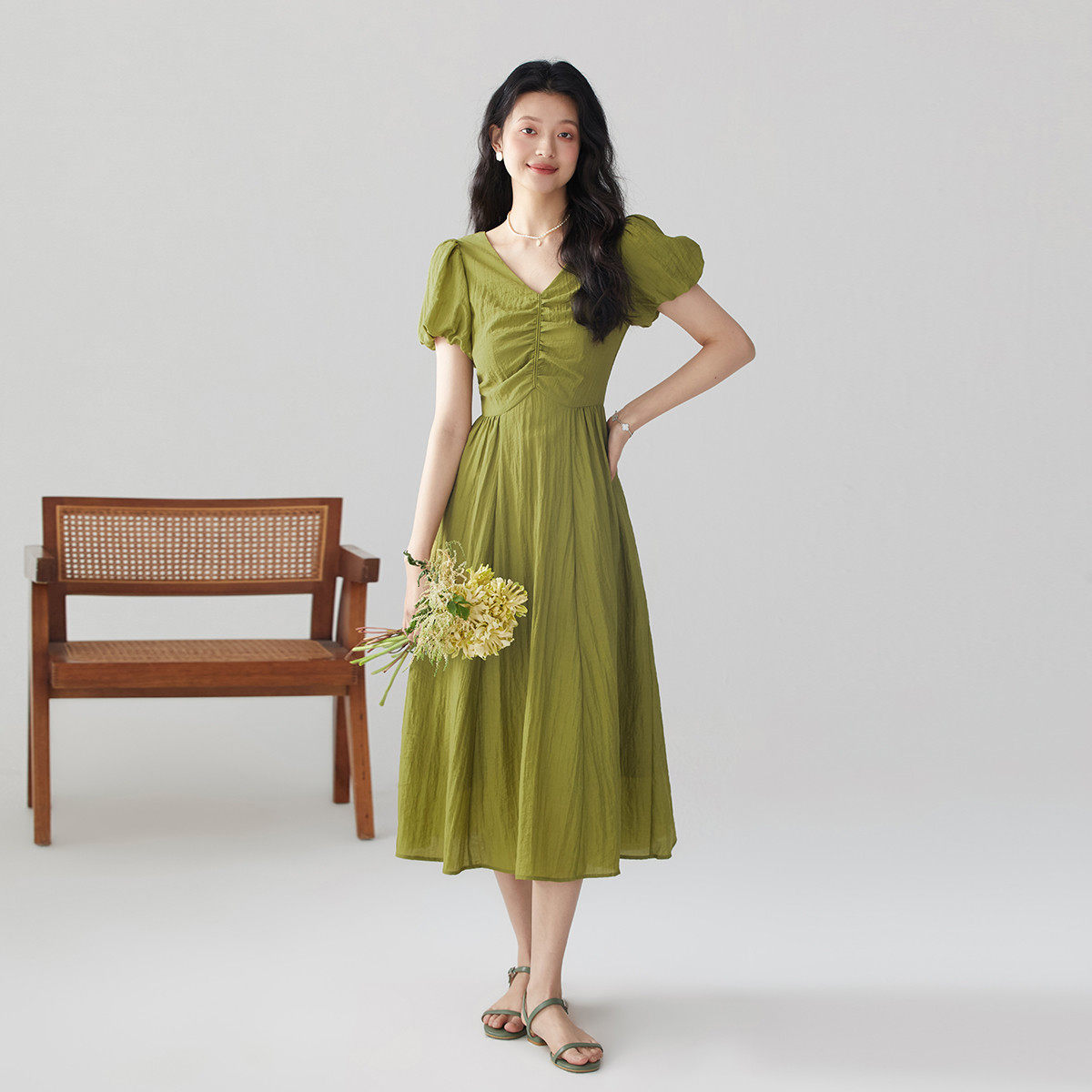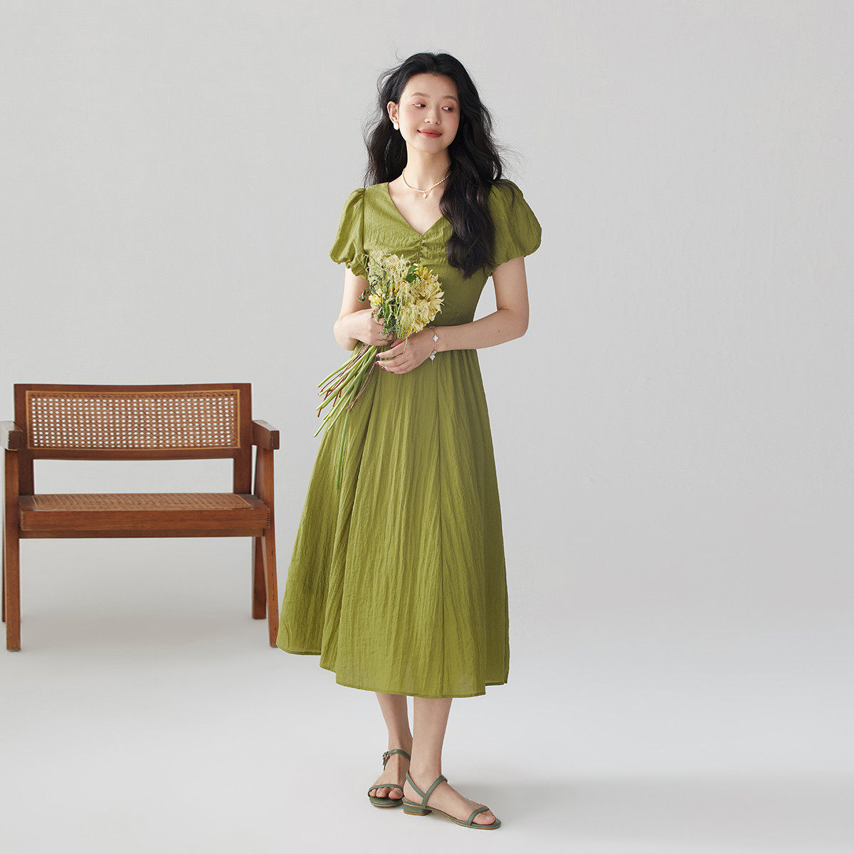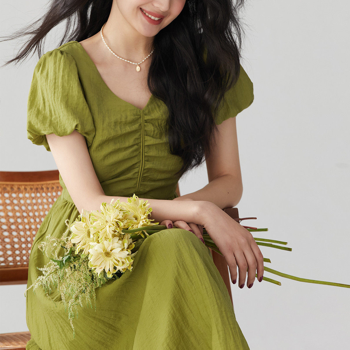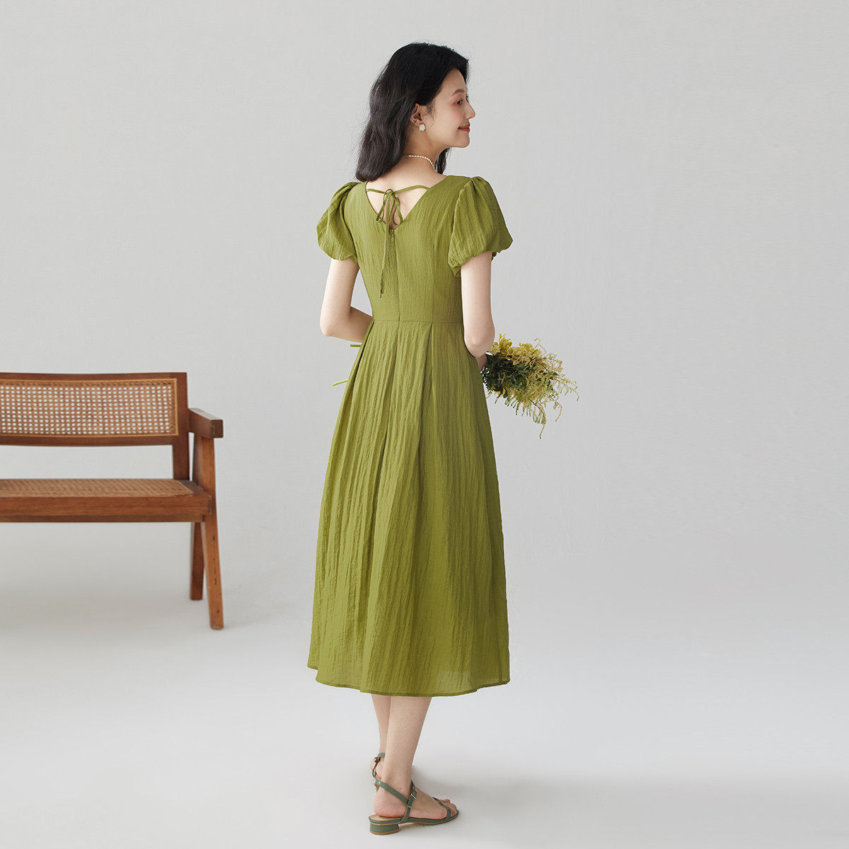 one more2025夏季新款法式泡泡袖短袖连衣裙女高级感v领度假裙子