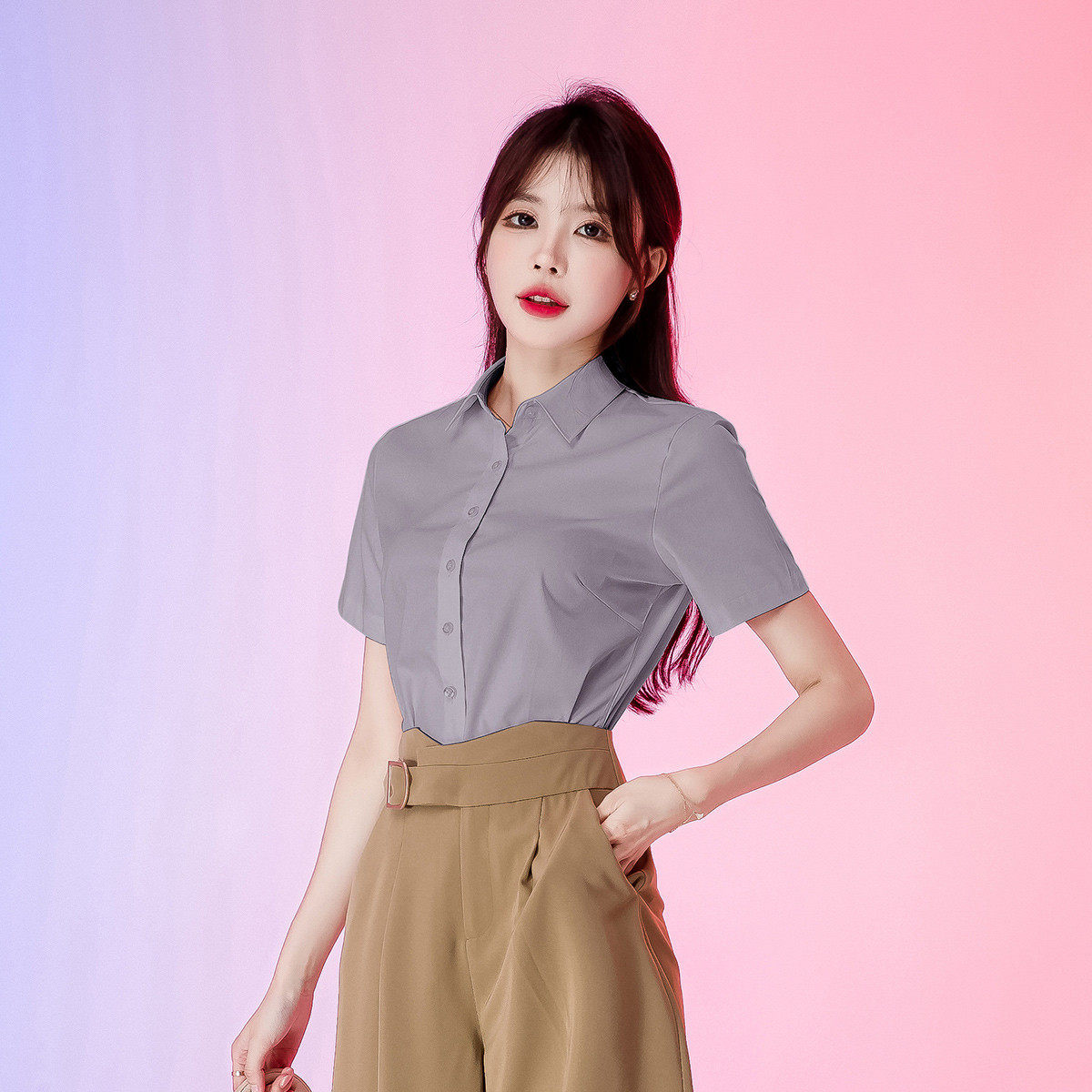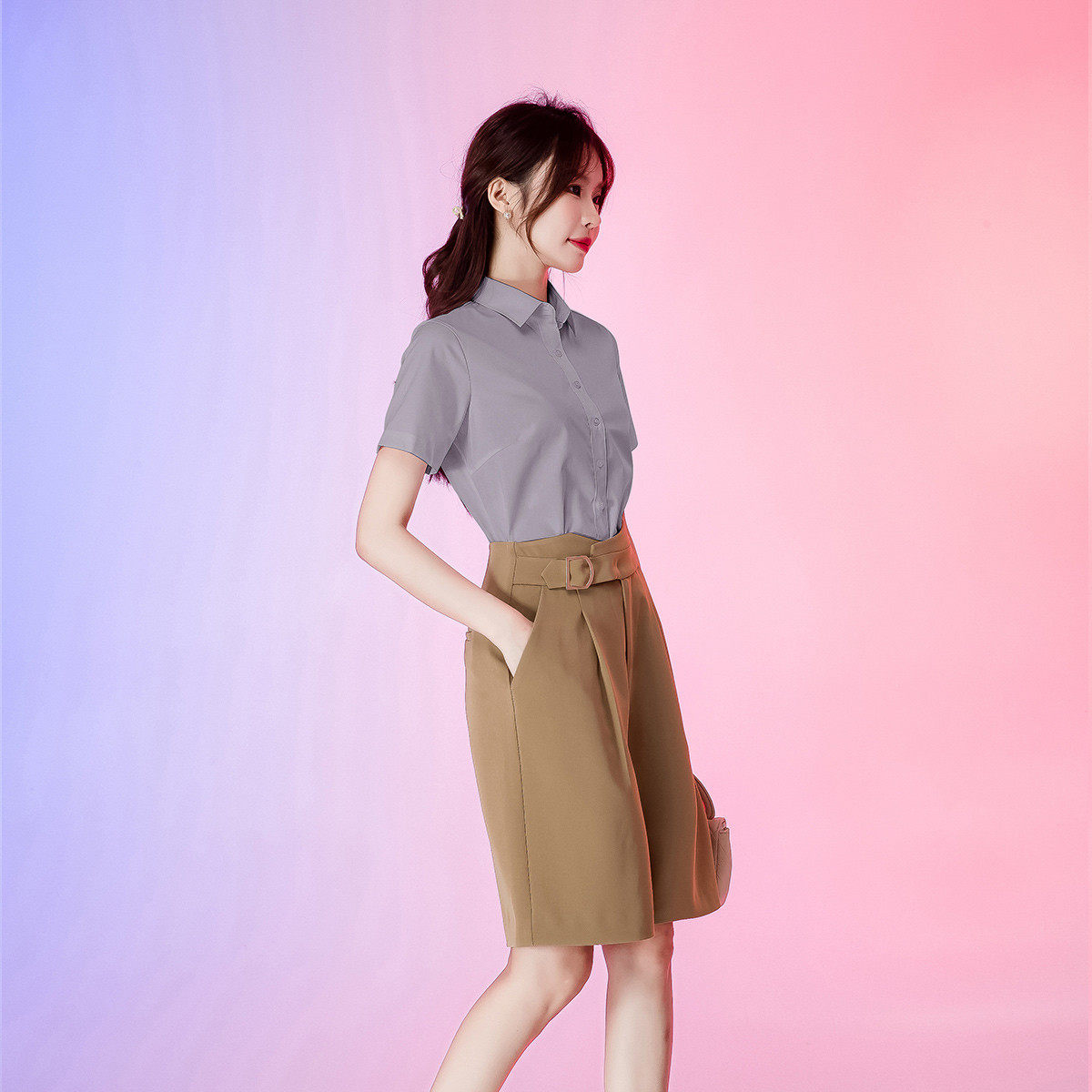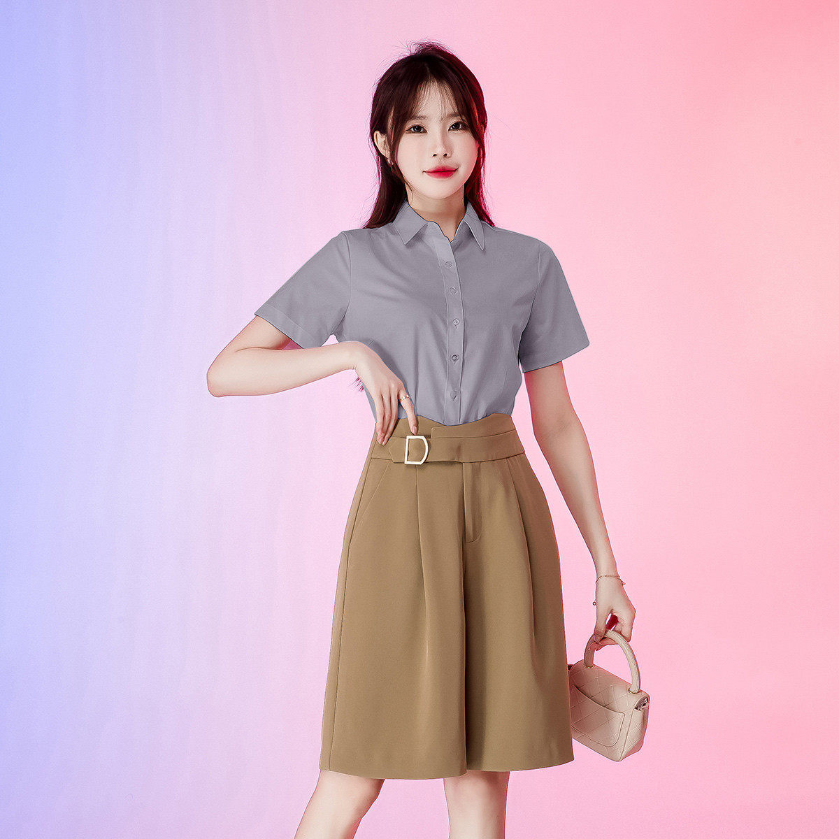 one more灰色方领衬衫女夏2025新款短袖职业工装衬衣薄款修身上衣