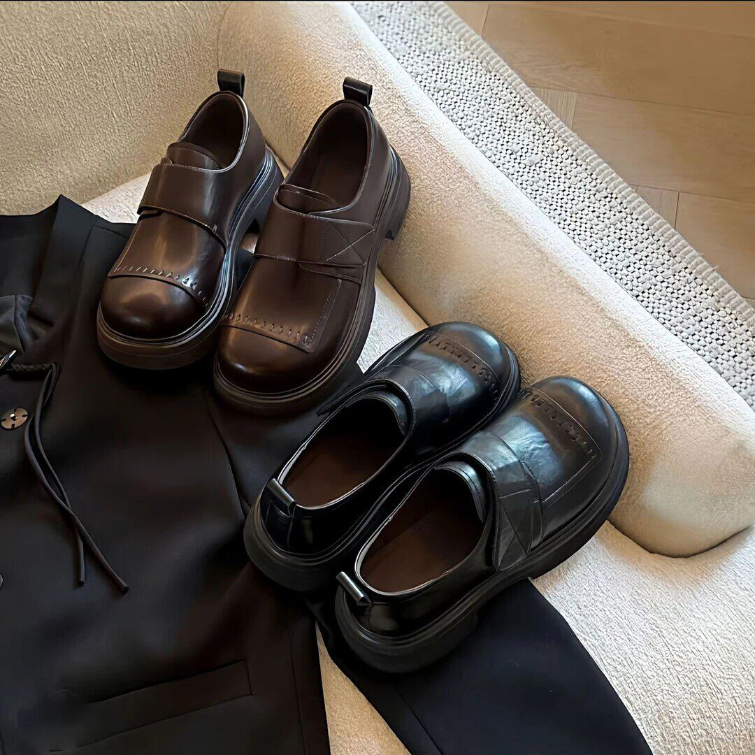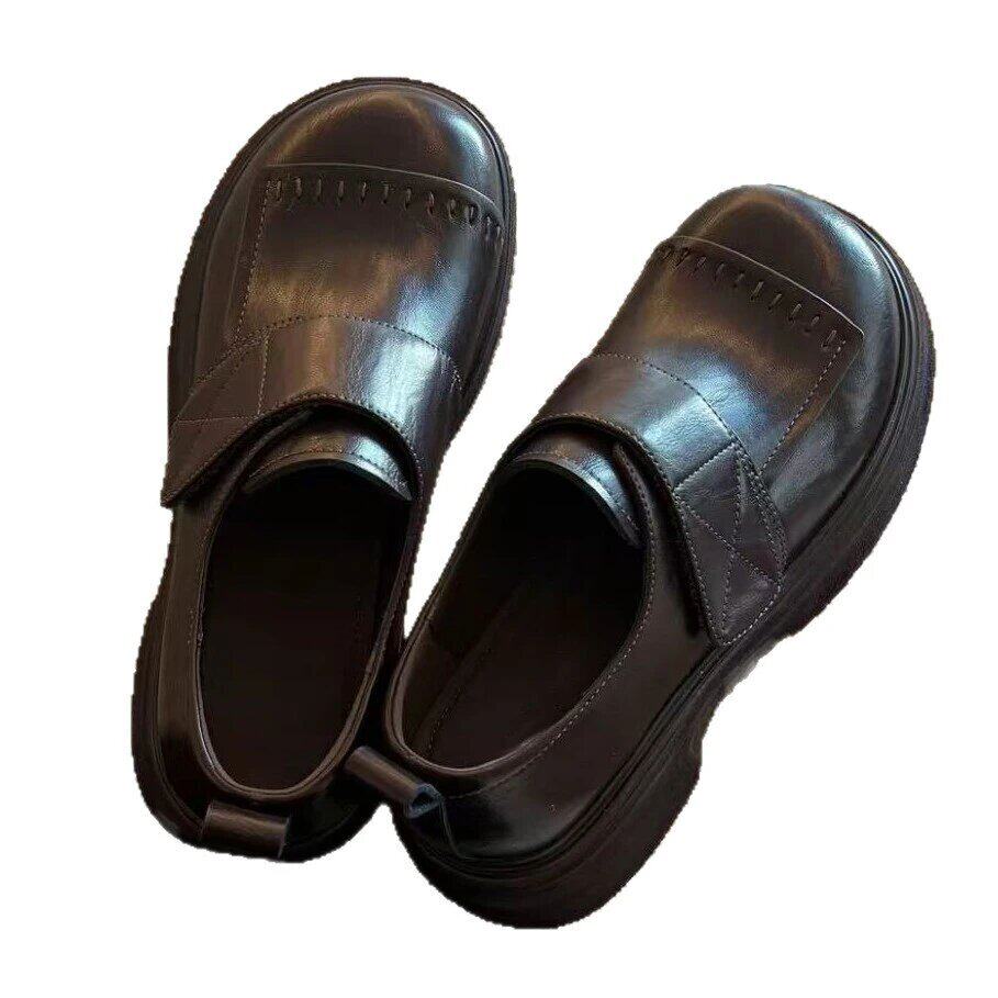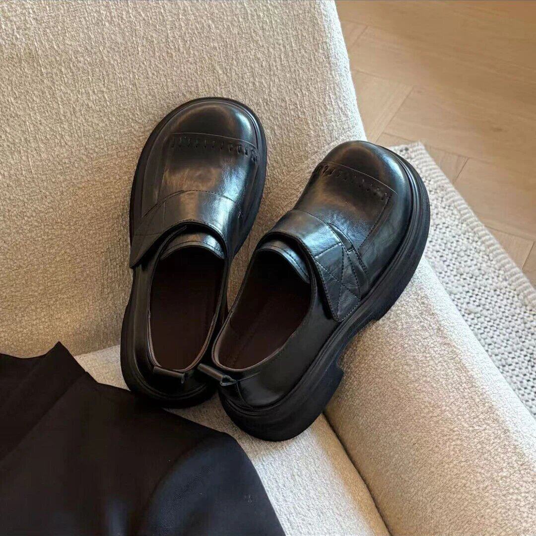 真皮复古厚底乐福鞋女春季魔术贴休闲百搭英伦学院风jk小皮鞋圆头