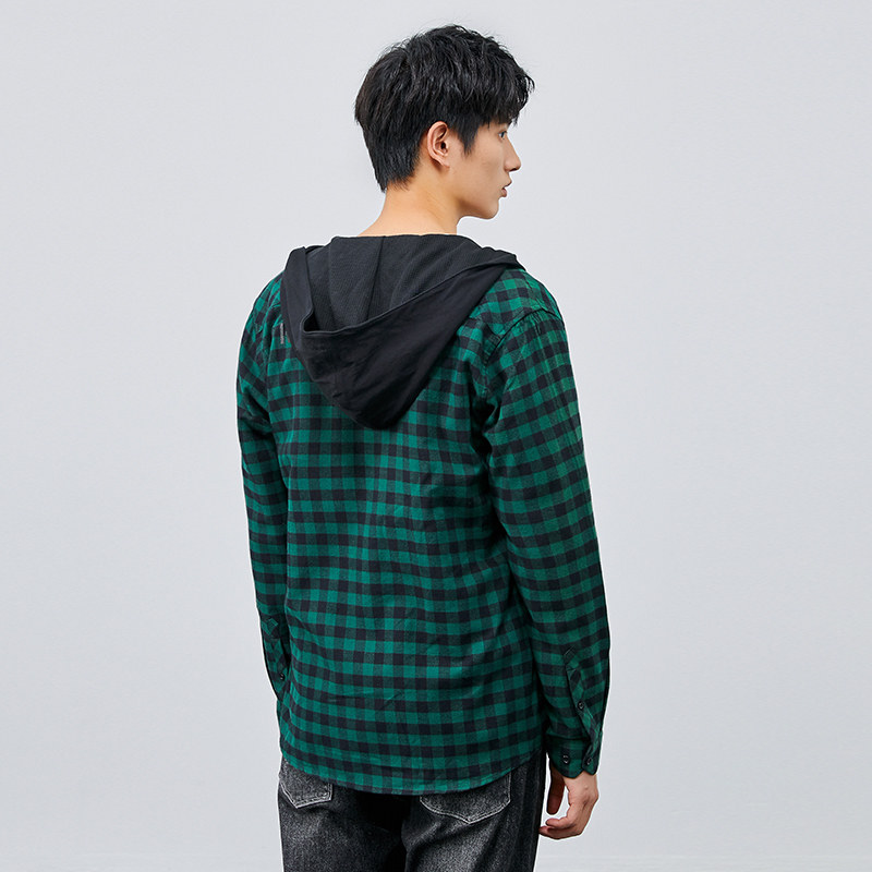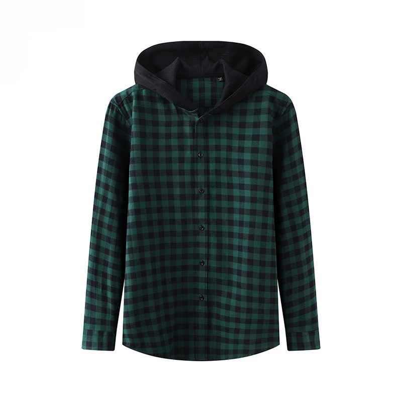 清仓撤标男装正品尾货奢华大牌上衣秋季休闲连帽长袖深绿格纹衬衫