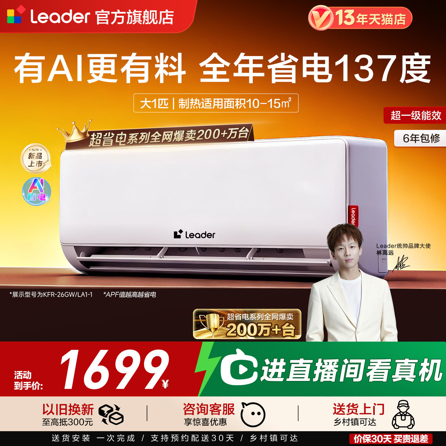 【超省电】海尔出品统帅空调大1匹一级能效变频卧室挂机26官方