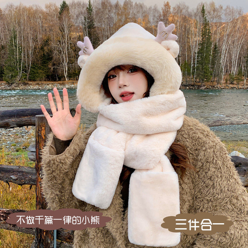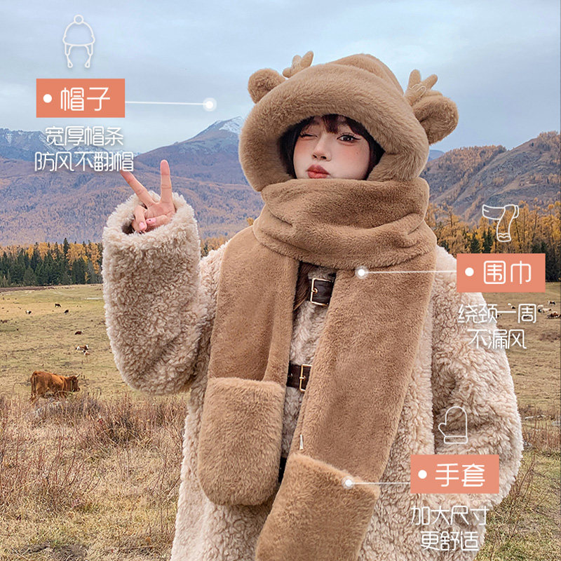 围巾帽子手套一体女连帽冬季帽可爱保暖围脖毛绒冬天三件套厚防寒