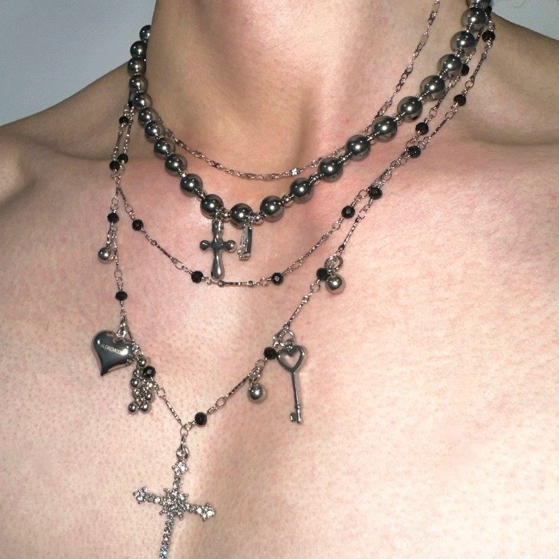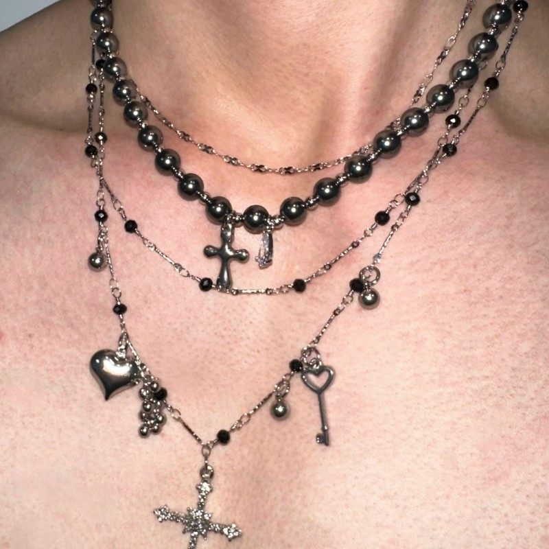 时尚潮流新款设计感银色珍珠恶魔果实十字钛钢多层百搭项链