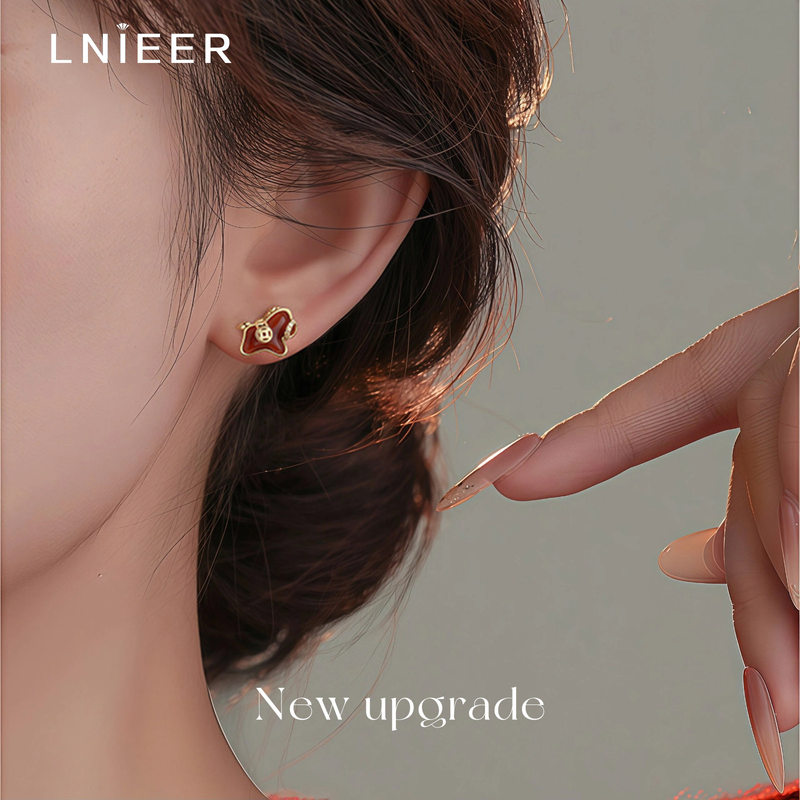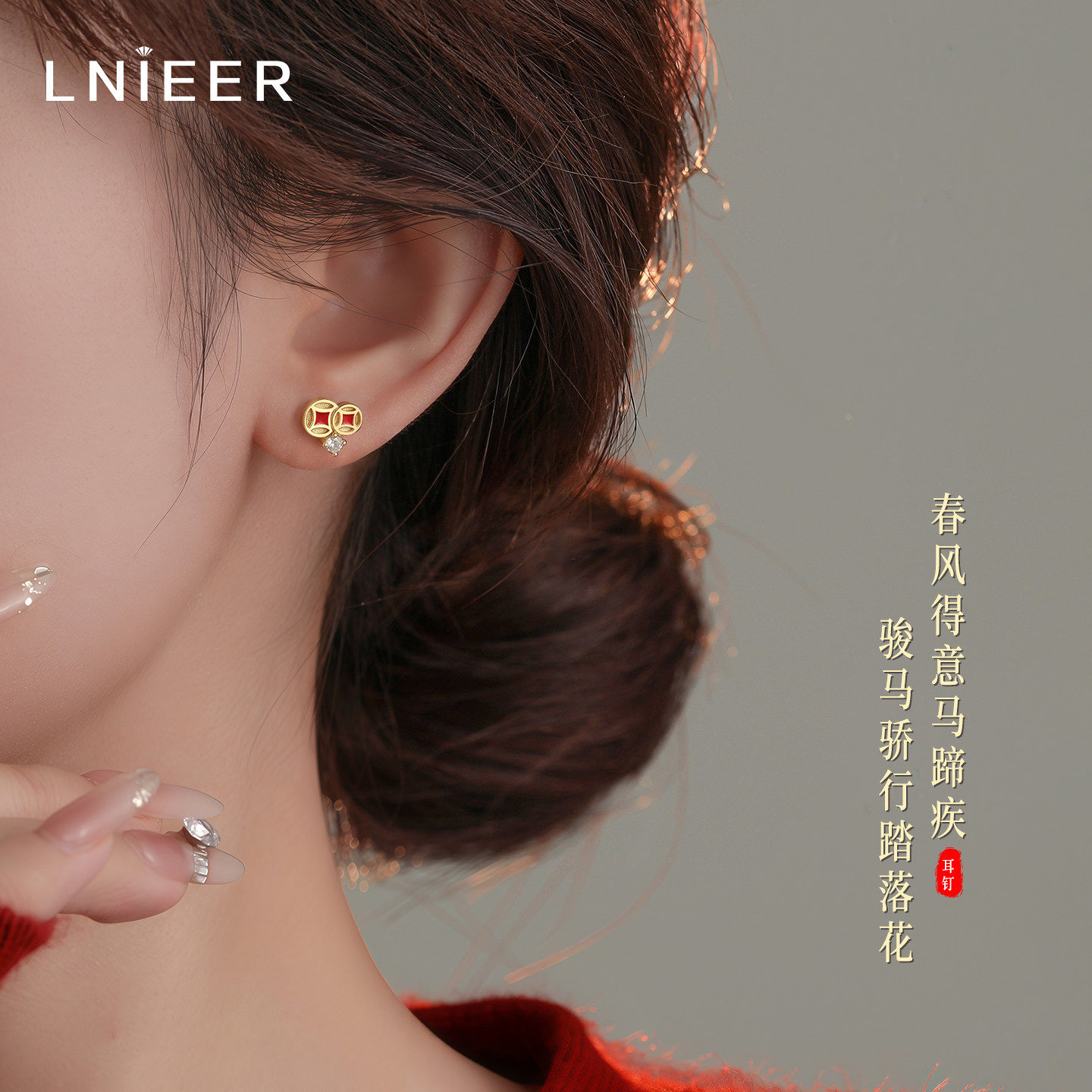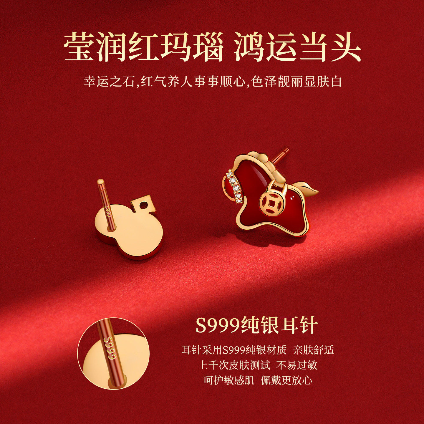 S999纯银针马上有钱耳钉女轻奢高级感耳环2026马年本命年红色耳饰