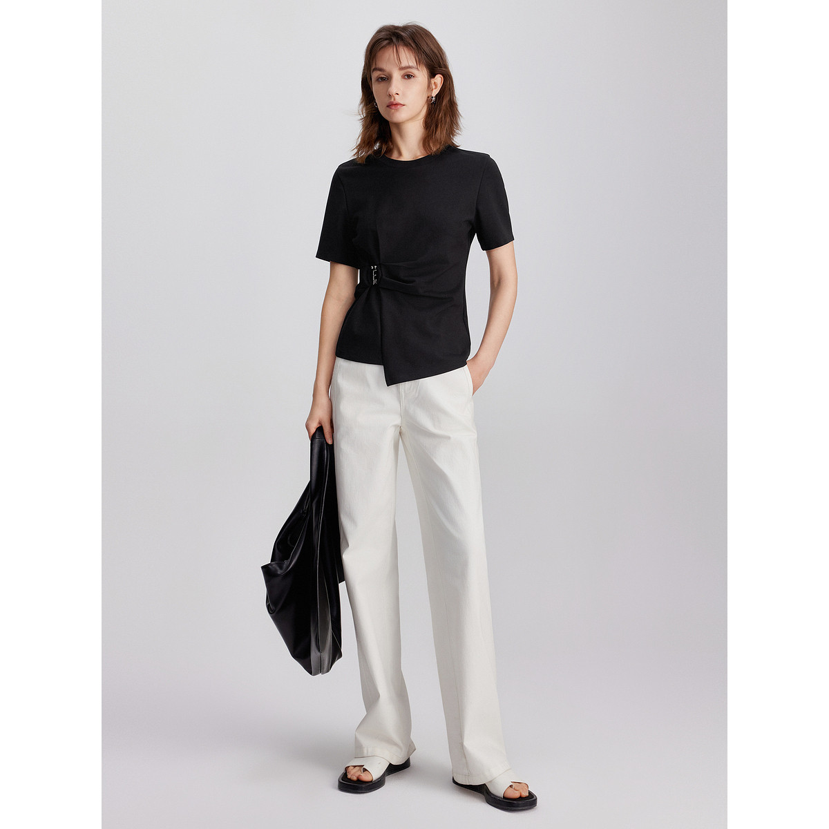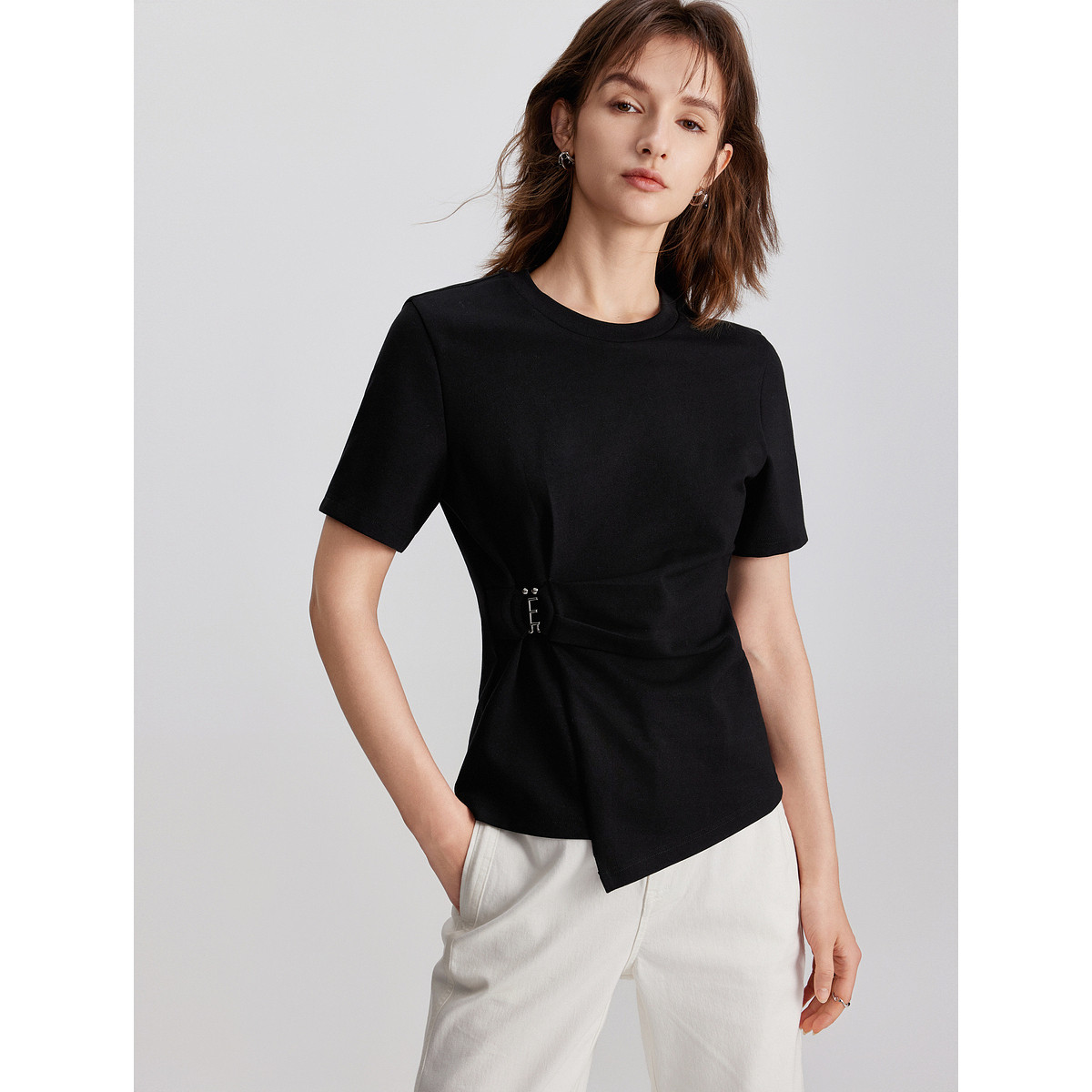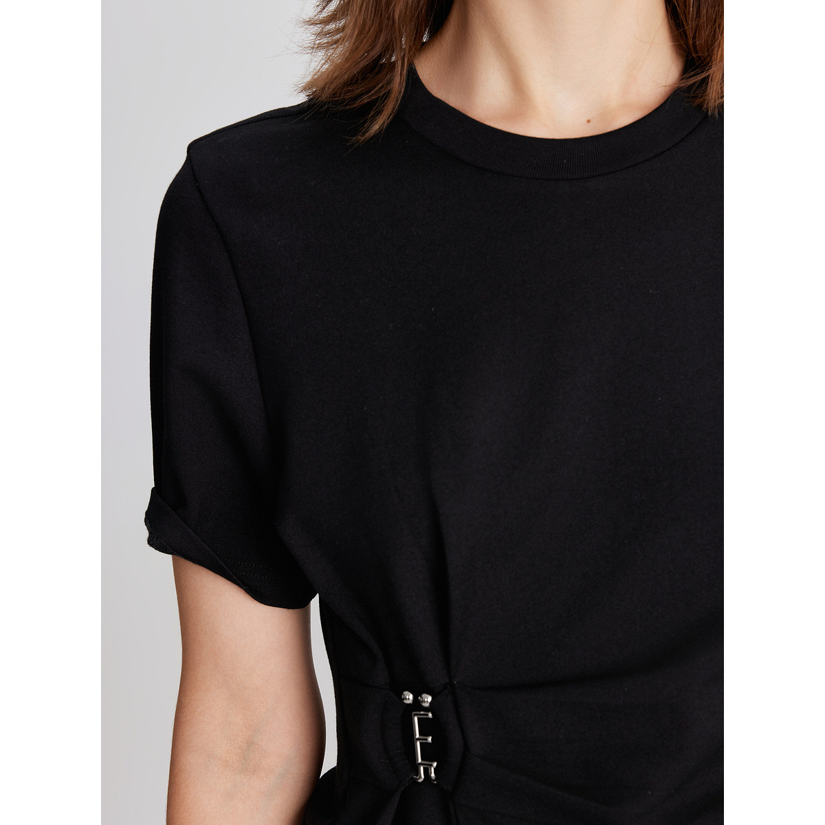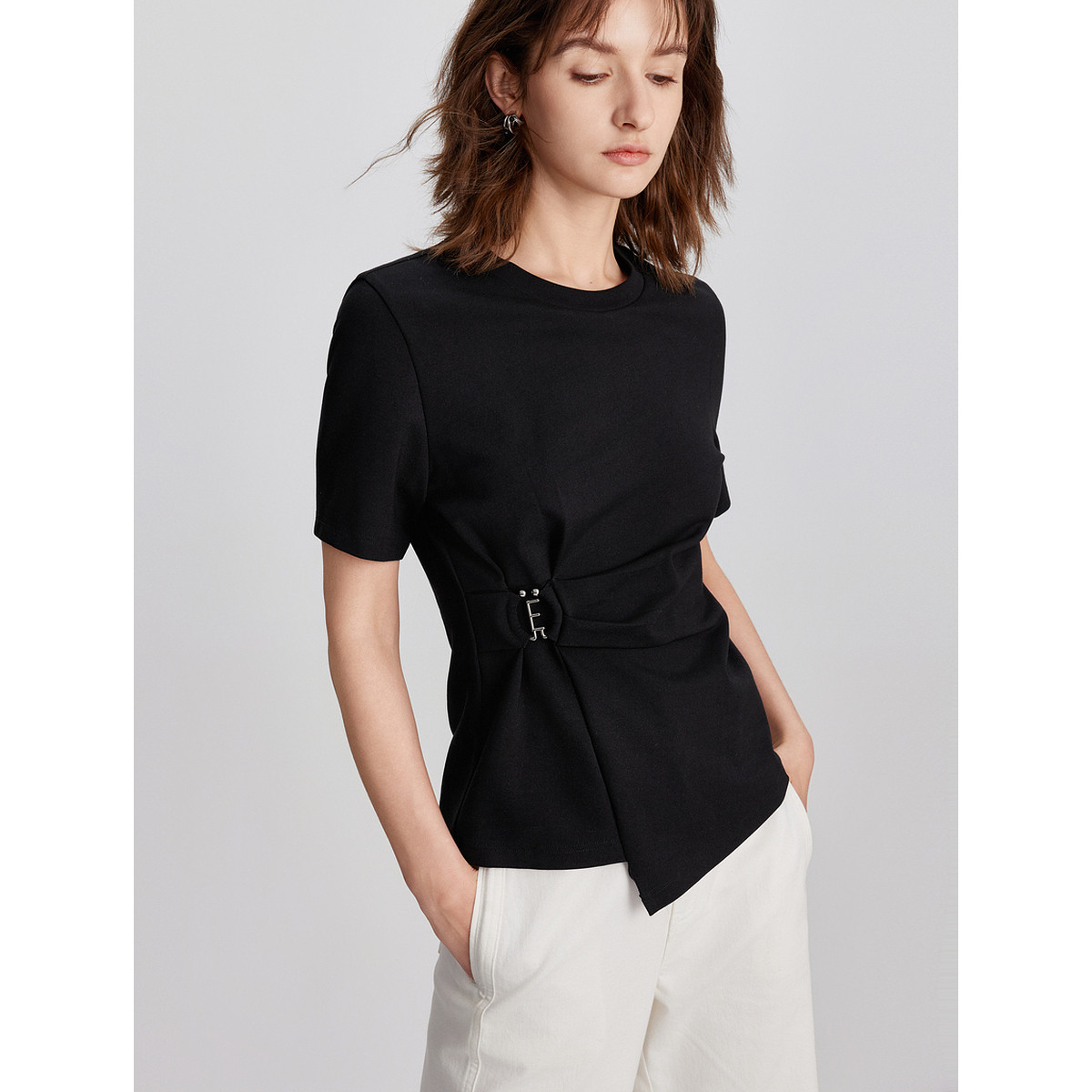 ELLE黑色设计感收腰显瘦短袖T恤女2025夏季新款小众修身正肩上衣