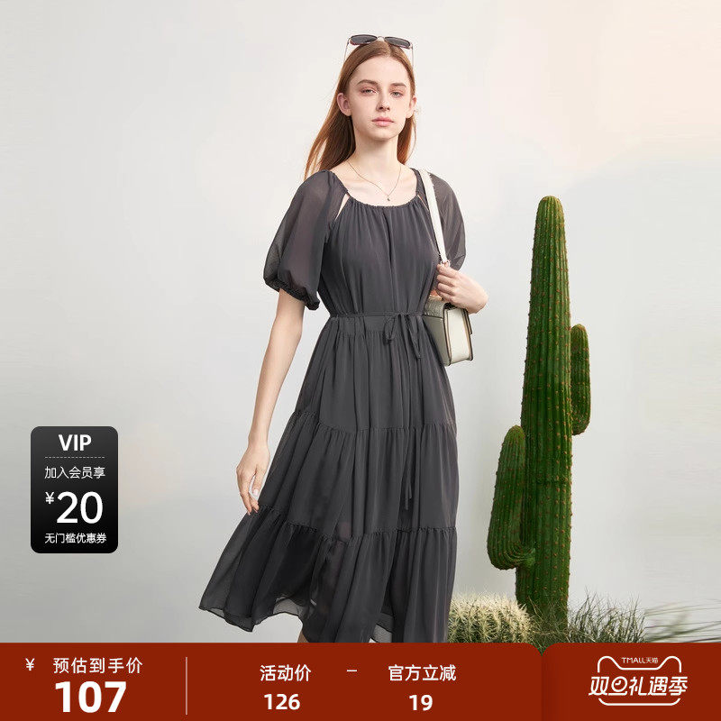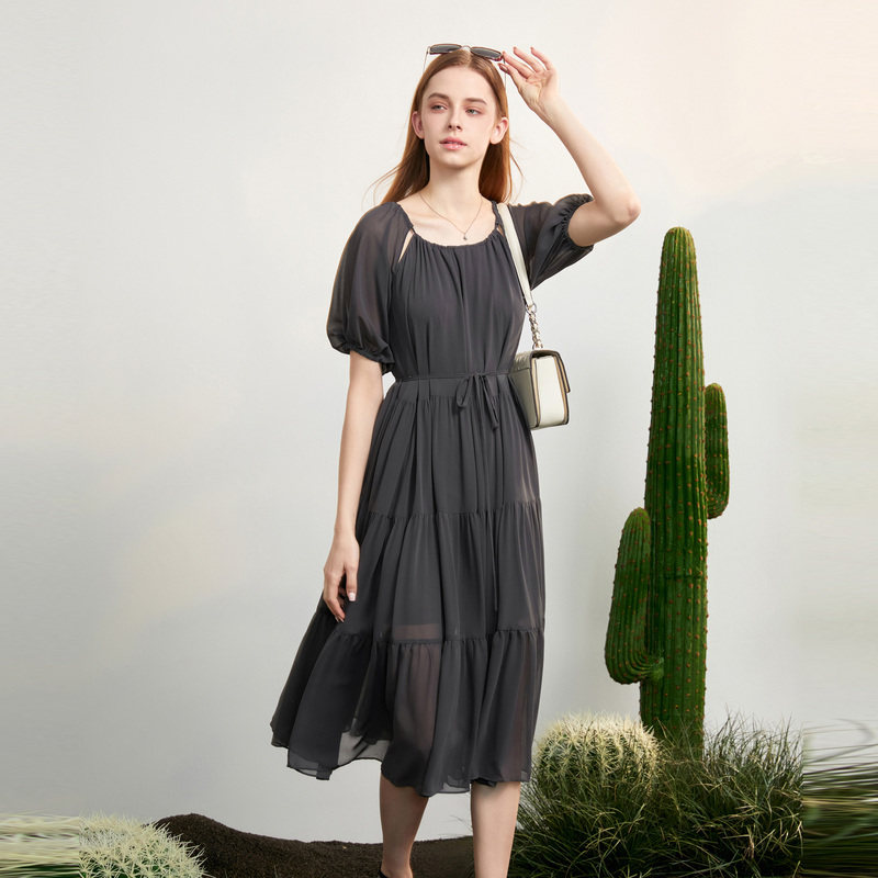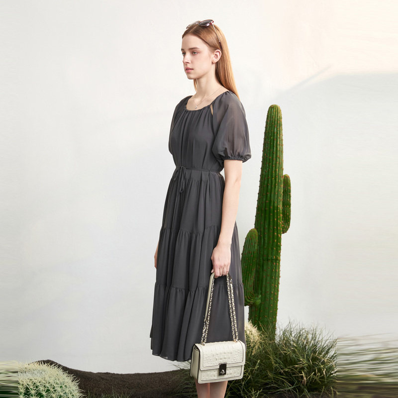 sdeer圣迪奥女装雪纺收腰镂空泡泡袖连衣裙S223Z121M