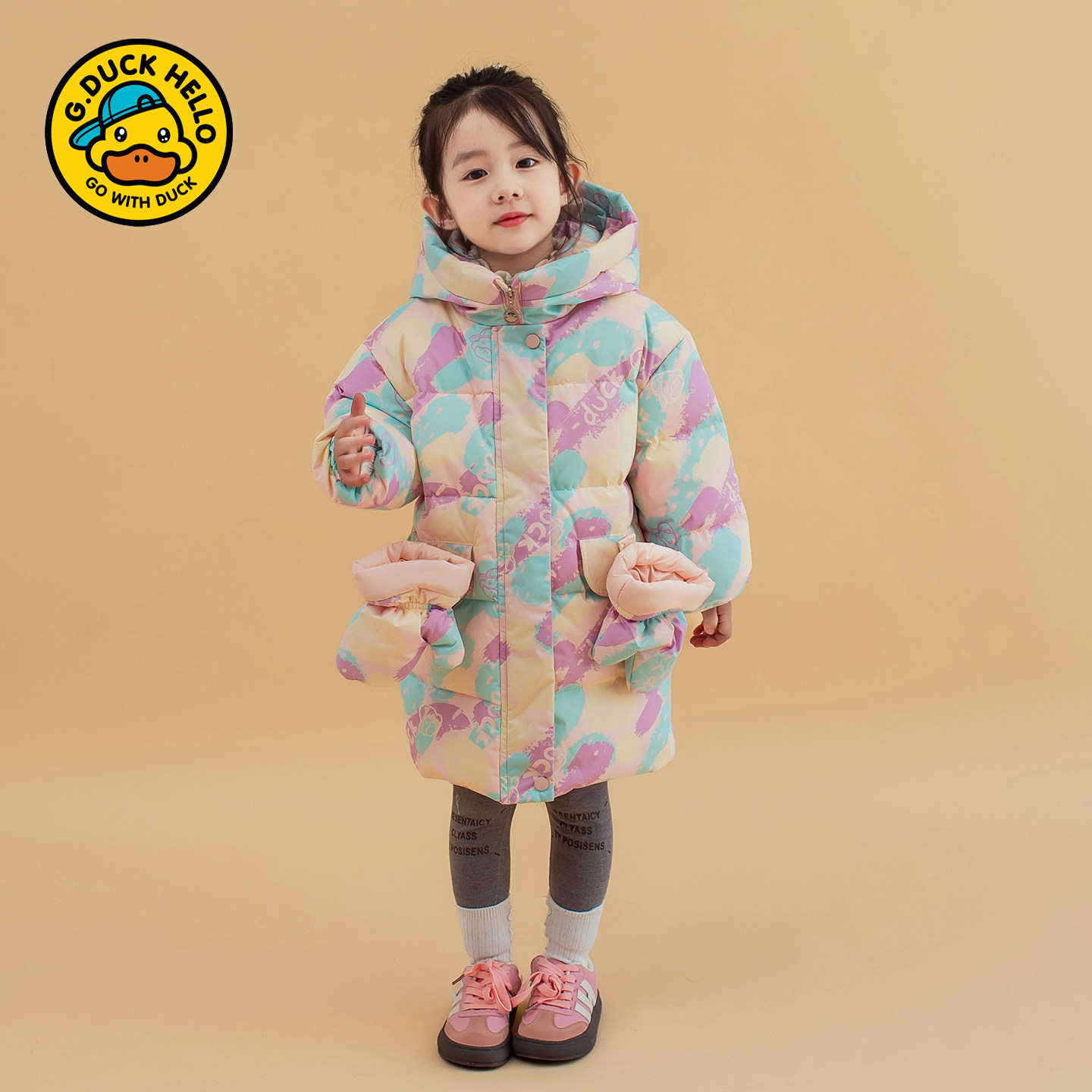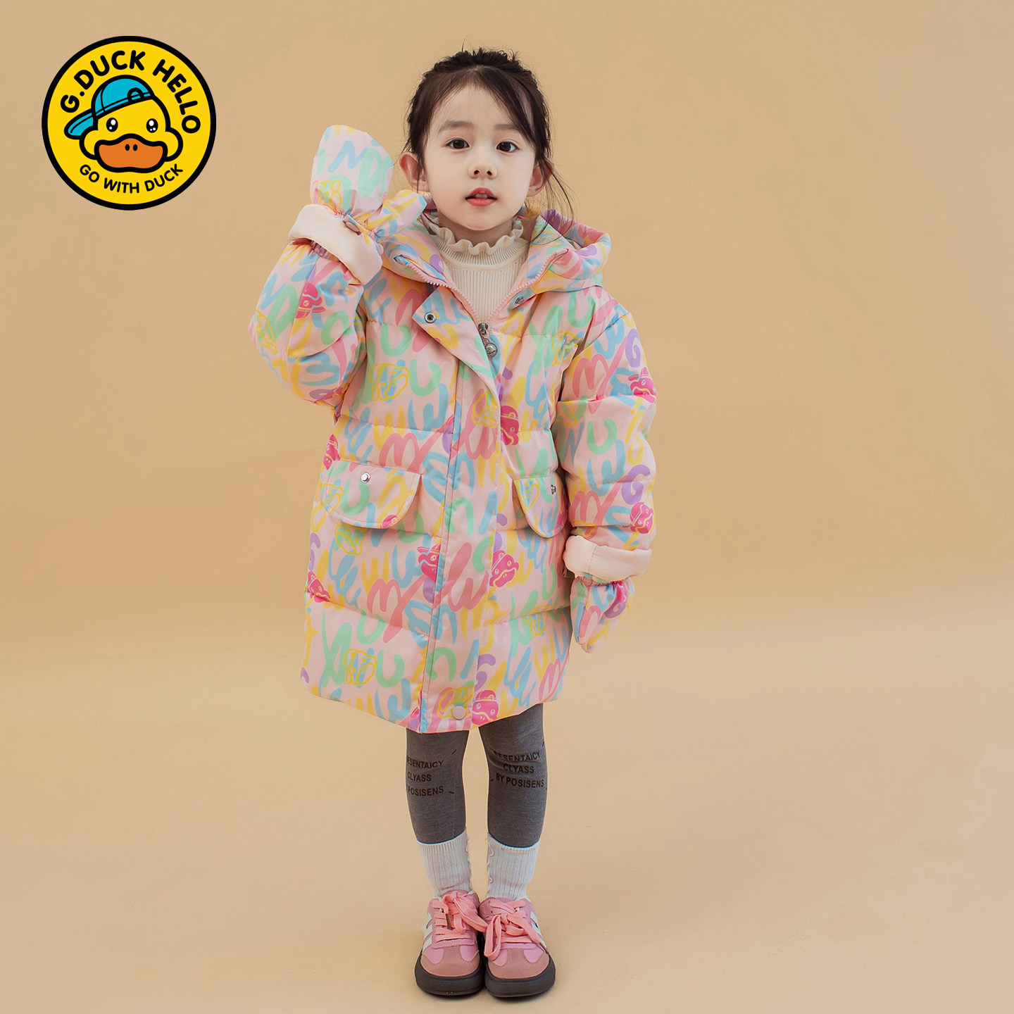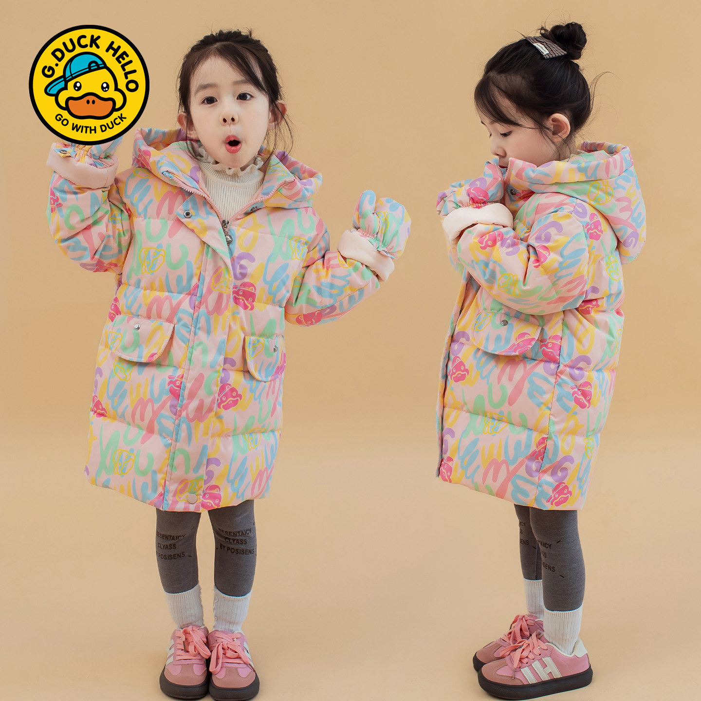 哈罗小黄鸭儿童羽绒服2025冬季新款男女童中长款加厚洋气外套粉色