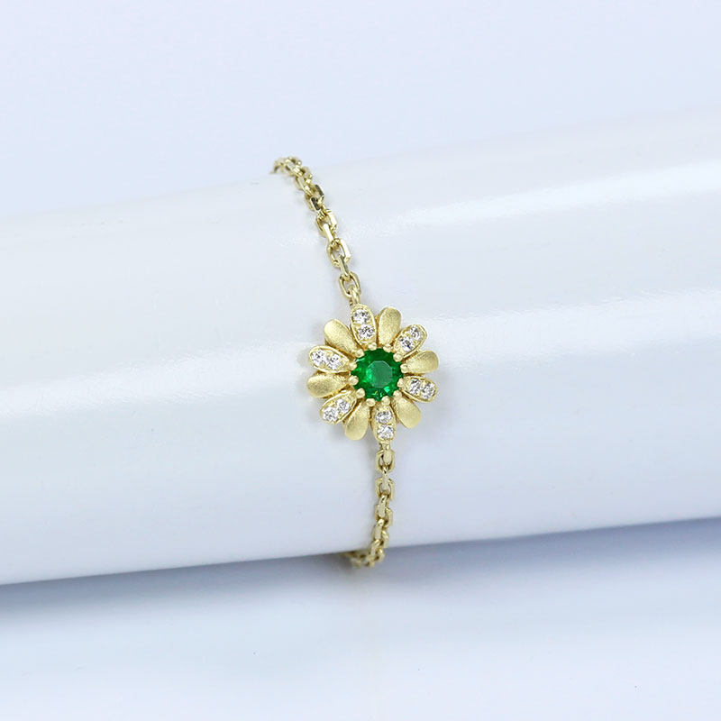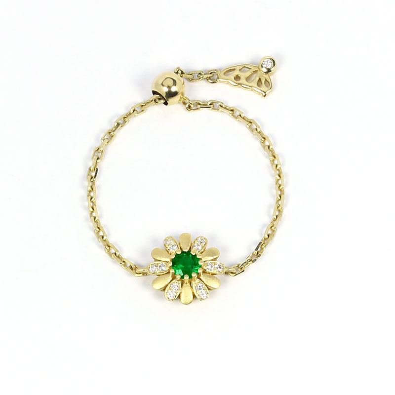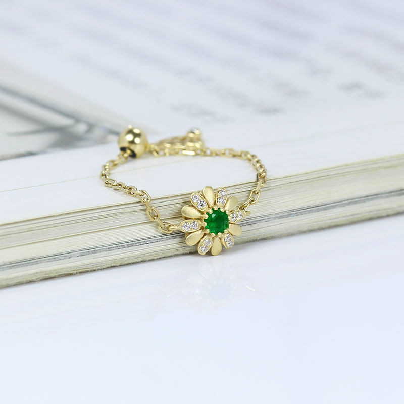 18K黄金天然祖母绿小雏菊软链条戒指 翠绿宝石可调节活口钻石指环
